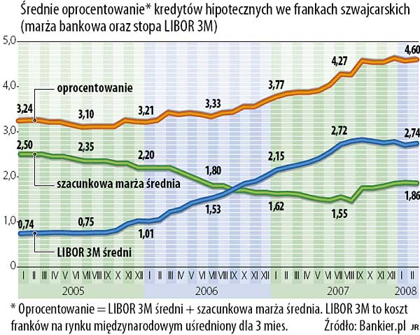 W tej sytuacji bardziej komfortowe warunki mają spłacający kredyty hipoteczne denominowane we frankach szwajcarskich. Co prawda także Szwajcarski Bank Centralny od wiosny 2006 r. podnosił stopy procentowe (łącznie o 1,75 pkt), ale ten cykl podwyżek chyba już został zakończony. Jednocześnie cały czas złotówka umacniała się wobec szwajcarskiej waluty, a bankowcy rezygnowali z części pobieranej marży. To pomogło zamortyzować większość podwyżki. Zadowoleni posiadacze kredytu we frankach nie mają jednak gwarancji, że ten trend się nie odwróci. Jeśli złotówka zacznie tracić na wartości, raty kredytów zaciąganych w szwajcarskiej walucie gwałtownie wzrosną (podobnie jak automatycznie zwiększy się pozostały do spłacenia dług).