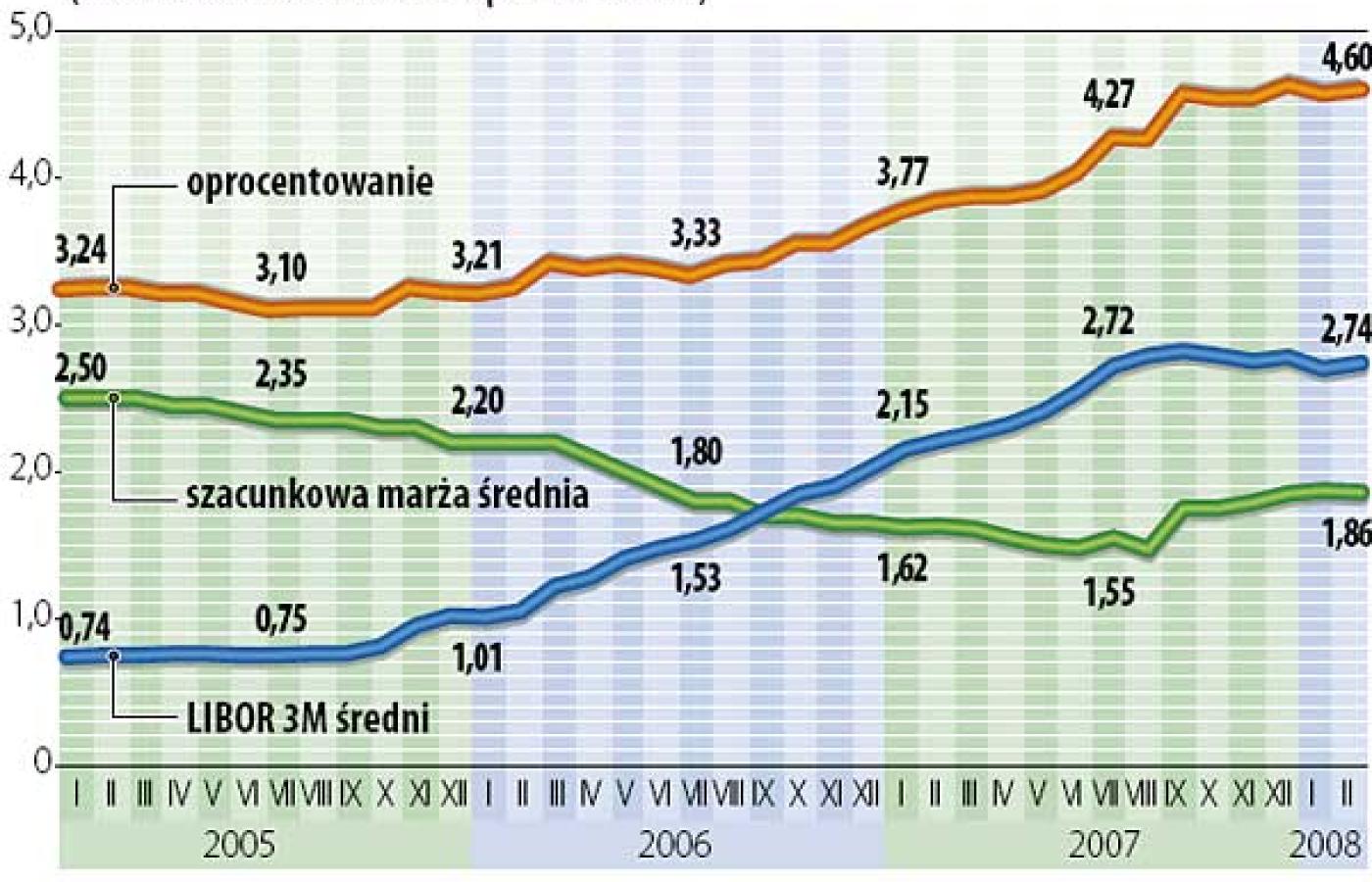 jącą się w gospodarce spiralą wzrostu cen (inflacją). Najważniejszym narzędziem, którym dysponuje, jest właśnie wysokość stóp procentowych rzutująca bezpośrednio na cenę kredytu. Według analityków z firmy doradczej Expander, w 2008 r. czekają nas jeszcze co najmniej dwie podwyżki, a koszt kredytu hipotecznego w złotówkach w grudniu 2008 r. dojść może do 8 proc. Są jednak i tacy, którzy uważają, że rozpęd RPP na razie się zatrzyma.