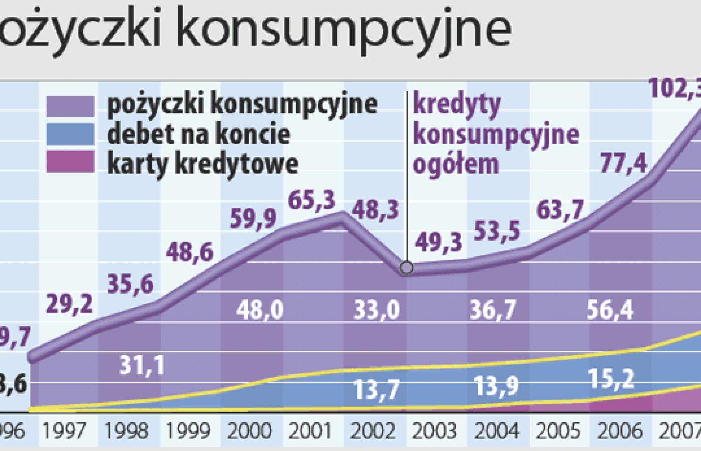Ale rosną też pożyczki określane w finansowym slangu jako tzw. szybkie pieniądze – kredyty konsumpcyjne. Banki kuszą: „pożyczka na dowód”, „pożyczka w kwadrans”, „wystarczy jeden klik w Internecie”. Nikt nie pyta na co. Na pralkę, kino domowe, wycieczkę, remont, studia dla dzieci. Z banku sami dzwonią, proponują. A my skwapliwie z tego korzystamy. Zadłużenie gospodarstw domowych z tytułu kredytów konsumpcyjnych zbliża się do 80 mld zł (w ciągu roku wzrost o 30 proc.). Karierę robi też plastikowy kredyt. Sklepy kuszą. Robisz u nas zakupy? Weź kartę kredytową! I bierzemy. W portfelach mamy ich już ponad 8 mln, przy czym tylko w ciągu ostatniego roku przybyło aż 2 mln (zadłużenie łączne – 9,2 mld zł). Karta kredytowa szybko wypiera popularną jeszcze do niedawna formę zadłużania się – debet na koncie.