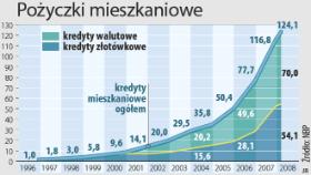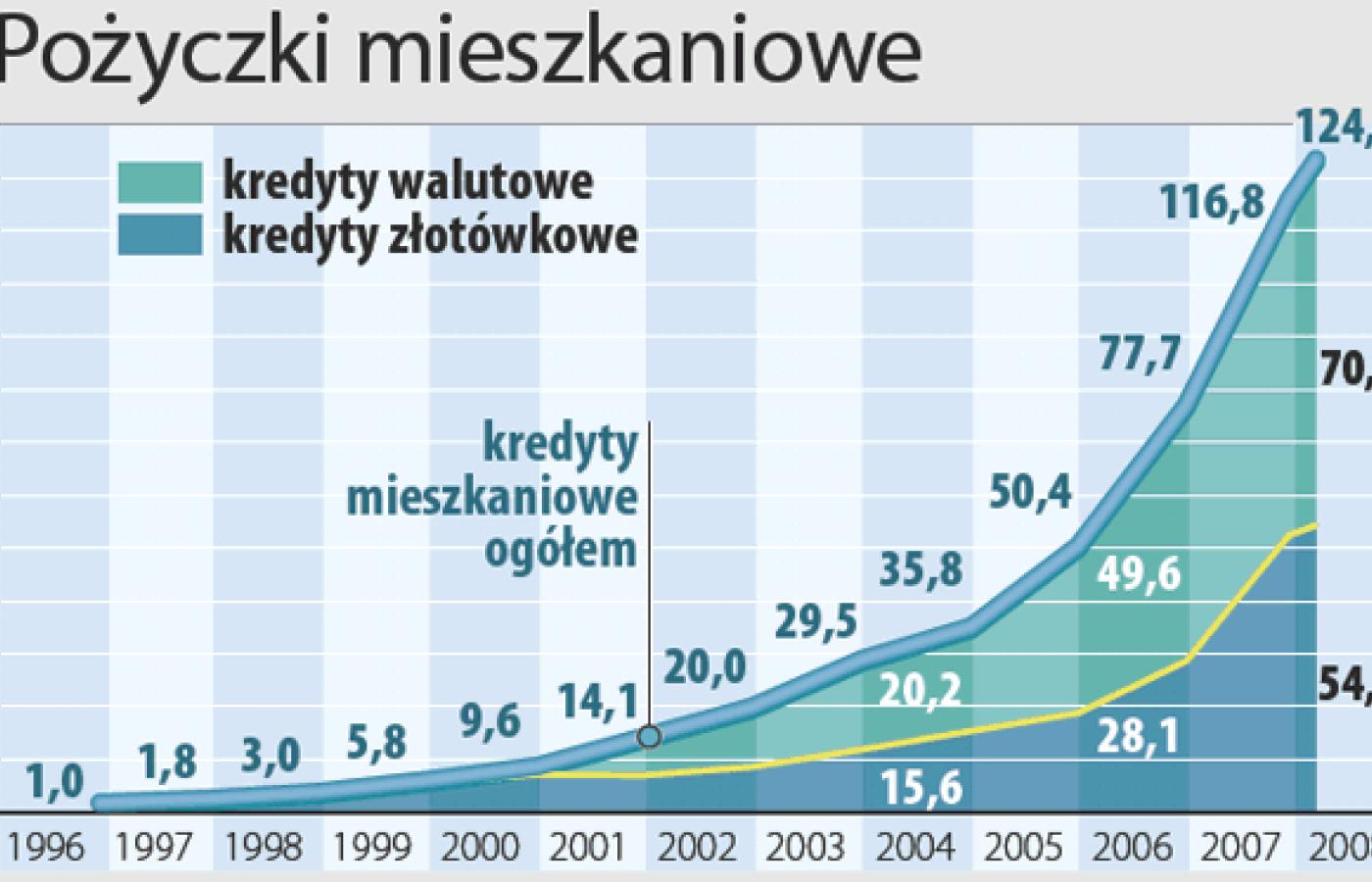 W dużej części za ten szalony wzrost odpowiadają kredyty hipoteczne. Pożyczamy coraz więcej na coraz droższe nieruchomości. Kredyt mieszkaniowy co roku zaciąga 300 tys. gospodarstw domowych. W 2007 r. banki pożyczyły na mieszkania rekordowe 57 mld zł (rok wcześniej było to 44 mld zł).