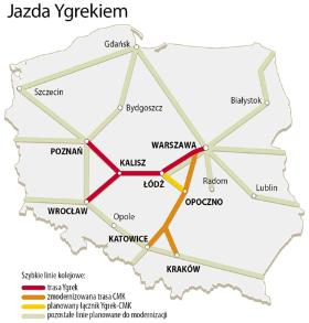 Rządowy plan zakłada budowę zupełnie nowej linii, nazywanej potocznie Ygrekiem (jej kształt będzie przypominał właśnie tę literę). Trasa zacznie się w Warszawie. Pociągi odjeżdżać będą z nowego Dworca Centralnego, który nawet nie został zaprojektowany. Z Warszawy szybka kolej ma jeździć do Łodzi. To miasto czeka największa inwestycja od wielu lat – podziemny tunel, który połączy dwa główne dworce – Łódź Fabryczną i Kaliską. Następnie z Łodzi trasa poprowadzi do Kalisza, który stanie się ważnym węzłem. Za Kaliszem nastąpi rozwidlenie Ygreka – jedna odnoga poprowadzi do Poznania, a druga do Wrocławia.