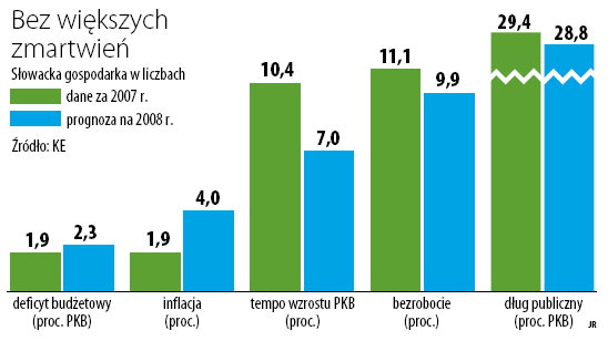 Bardziej niż swoimi przyszłymi problemami słowaccy ekonomiści przejmują się kłopotami sąsiednich państw. Kulejąca gospodarka węgierska może skłonić do powrotu 30 tys. pracujących tam Słowaków, z którymi dwuipółmilionowy słowacki rynek pracy nie od razu sobie poradzi. Perturbacje w Polsce i w Czechach nadszarpnęły zaufanie inwestorów do całego regionu. Niewykluczone, że już niebawem ogarnięte recesją Niemcy ograniczą zakupy produkowanych na Słowacji samochodów i sprzętu AGD, więc tutejsze fabryki zaczną masowo zwalniać pracowników. Mimo to Słowacy nie tracą rezonu. – W tym roku spodziewamy się 7,5-proc. wzrostu gospodarczego – przewiduje Ivan Mikloš, były minister finansów. – Oczekiwaliśmy, że w 2009 r. PKB zwiększy się o 6,5 proc., jednak kryzys wyhamuje wzrost do około 5 proc.