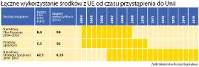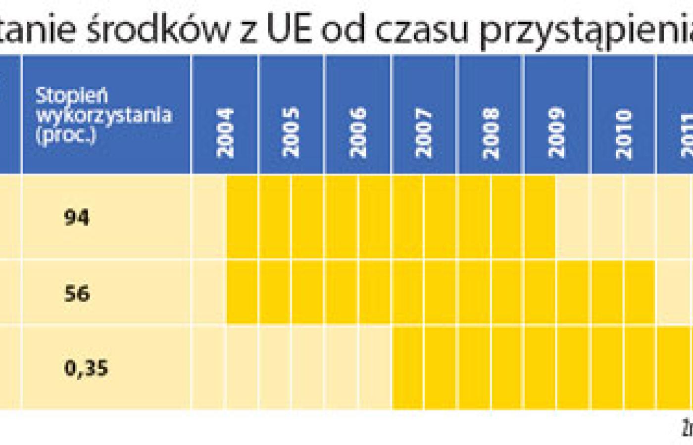 Janusz Palikot i inni politycy Platformy chętniej mówią o tym, jak dobrze Polska dotąd wykorzystywała środki z Brukseli. Po wejściu do Unii otrzymaliśmy najpierw pieniądze na lata 2004–2006 z zastrzeżeniem, że możemy je wydawać do końca 2008 r. Z powodu ostrego kryzysu gospodarczego w całej Europie Bruksela postanowiła potem przedłużyć ten termin o pół roku. Polska do tej pory wykorzystała ponad 90 proc. tych pieniędzy i jest to wynik, jak na unijne standardy, bardzo dobry.