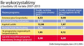 Zdecydowanie najlepiej prezentuje się natomiast program Kapitał Ludzki, przeznaczony na różnego rodzaju szkolenia, przekwalifikowywanie bezrobotnych i wspieranie urzędów pracy. Do tej pory rozdzielono 13 proc. środków, a wydano prawie 2 proc. Także wiele firm otrzymało już wsparcie w ramach programu Innowacyjna Gospodarka. – To przede wszystkim zasługa Polskiej Agencji Rozwoju Przedsiębiorczości, którą można nazwać kołem zamachowym tego programu. Znacznie gorzej jest natomiast na poziomie regionalnym. Tam konkursy dla firm są opóźnione – mówi Jerzy Kwieciński, wiceprezes Europejskiego Centrum Przedsiębiorczości.