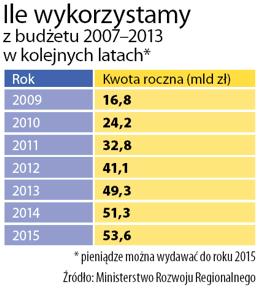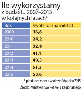 Nadzieją dla rządu są doświadczenia sprzed kilku lat. W 2004 i 2005 r. polskie media pełne były ostrzeżeń, że początek naszego członkostwa w Unii okaże się kompromitacją, bo nie zdołamy wydać na czas pieniędzy z pierwszych funduszy. Ten czarny scenariusz się nie zrealizował. Jednak Prawa i Sprawiedliwości nawet te argumenty nie przekonują. – Wówczas wskaźniki wykorzystania środków, choć słabe, były znacznie lepsze niż teraz – podkreśla Grażyna Gęsicka. Rząd zaprezentował tymczasem bardzo ambitny plan, który ma rozwiać wszelkie obawy. – Mamy konkretny harmonogram aż do 2015 r. Tylko w obecnym z nowych pieniędzy unijnych chcemy wydać ponad 16 mld zł – zapewnia Elżbieta Bieńkowska, obecna minister rozwoju regionalnego. W przyszłym roku ta kwota ma się zwiększyć do 24 mld zł i rosnąć w kolejnych latach.