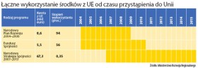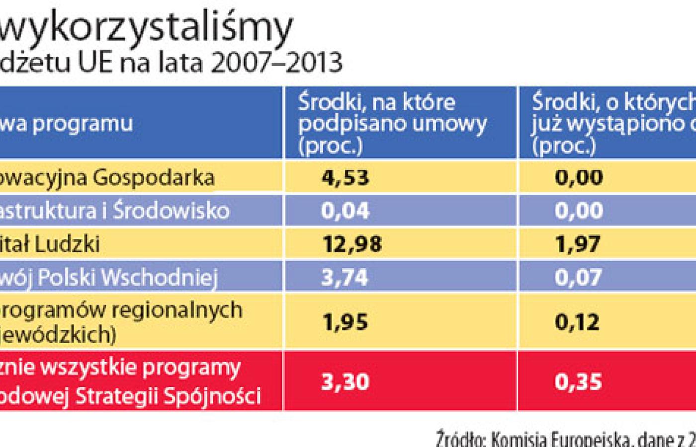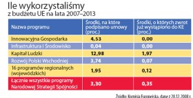 Dziś PO i PiS licytują się, ile miliardów wydały kolejne koalicje i komu wobec tego przypadnie splendor. Głównie chodzi jednak o kolejne pieniądze z tzw. nowej perspektywy budżetowej UE. Pod tym hasłem kryje się słynne 67,3 mld euro, czyli ponad 269 mld zł (przy kursie 4 zł za 1 euro), których zdobycie pod koniec 2005 r. tak radośnie świętował ówczesny premier Kazimierz Marcinkiewicz. Te olbrzymie pieniądze musimy wydać do końca 2015 r. I na razie mamy z nimi rzeczywiście sporo problemów. Do końca 2008 r. Polska wykorzystała 0,35 proc. całej puli. Te dane w dramatycznej formie prezentowała Grażyna Gęsicka. Dla rządu ważniejsze jest, że udało się już podpisać umowy na ponad 3 proc. funduszy, które Polska ma do dyspozycji. – To i tak fatalne wyniki. Jedyną pozytywną informacją jest fakt, że rząd wreszcie zdał sobie sprawę z wagi problemu. Bo wcześniej w ogóle go ignorował – krytykuje Grażyna Gęsicka.