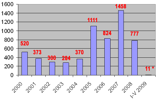 Roczna liczba zamówień na nowe samoloty, złożonych w konsorcjum Airbus, * dane za styczeń - maj 2009, źródło: spółka