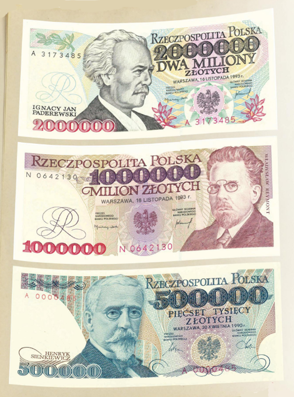 • Do obiegu wchodzą banknoty 100 000 zł z Moniuszką i 500 000 zł z Sienkiewiczem. To pierwsze banknoty przejściowe – niektóre elementy pochodzą jeszcze z PRL (najdłuższy żywot miał znak wodny), inne już z III RP.