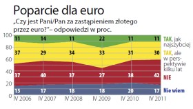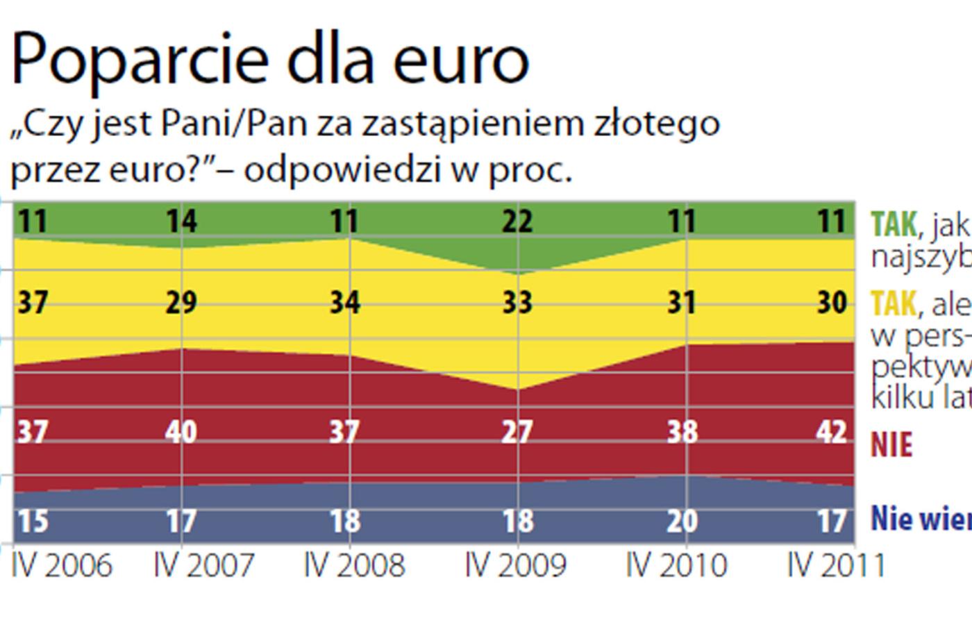 Gdy kurs złotego się uspokoił, a na jaw zaczęły wychodzić problemy strefy euro, liczba przeciwników wspólnej waluty znów wzrosła. Jest ona w tej chwili większa niż tych, którzy życzą sobie pożegnania ze złotym. W ostatnich badaniach CBOS z marca 2011 r., przeprowadzanych już po ujawnieniu problemów Grecji, Irlandii i Portugalii, zaledwie 30 proc. ankietowanych rodaków chciałoby wprowadzenia w Polsce euro. Natomiast aż 60 proc. woli pozostać ze złotym w swoich portfelach.