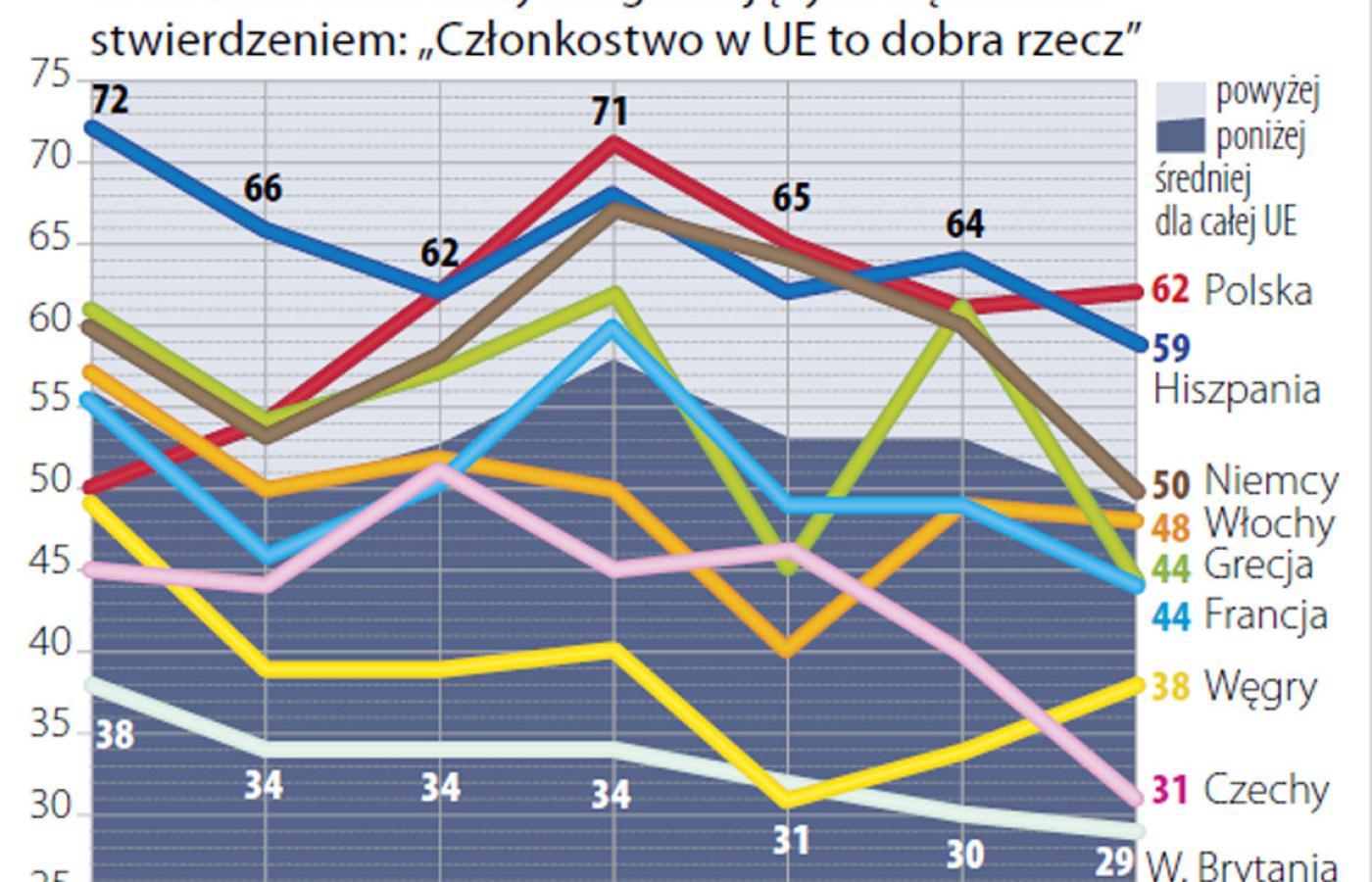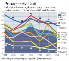 Polacy stają się coraz większymi euroentuzjastami, gdy wiele narodów, zwłaszcza w Europie Zachodniej, przechodzi na pozycje dokładnie odwrotne. Od 2004 r. odsetek Hiszpanów zadowolonych z obecności w Unii spadł z 72 do 59 proc., a Niemców i Francuzów, których kraje uważane są przecież za motory integracji, odpowiednio z 60 do 50 i z 56 do 44 proc. Niewiele lepiej jest w naszym regionie, tak intensywnie korzystającym z funduszy unijnych. Jeszcze siedem lat temu 45 proc. Czechów uważało członkostwo w Unii za dobrą rzecz, a teraz pozytywnie na ten temat wypowiada się 31 proc. Choć szczyt naszego zadowolenia z integracji przypadł na 2007 r., późniejsze spowolnienie gospodarcze tylko trochę pogorszyło wskaźniki.