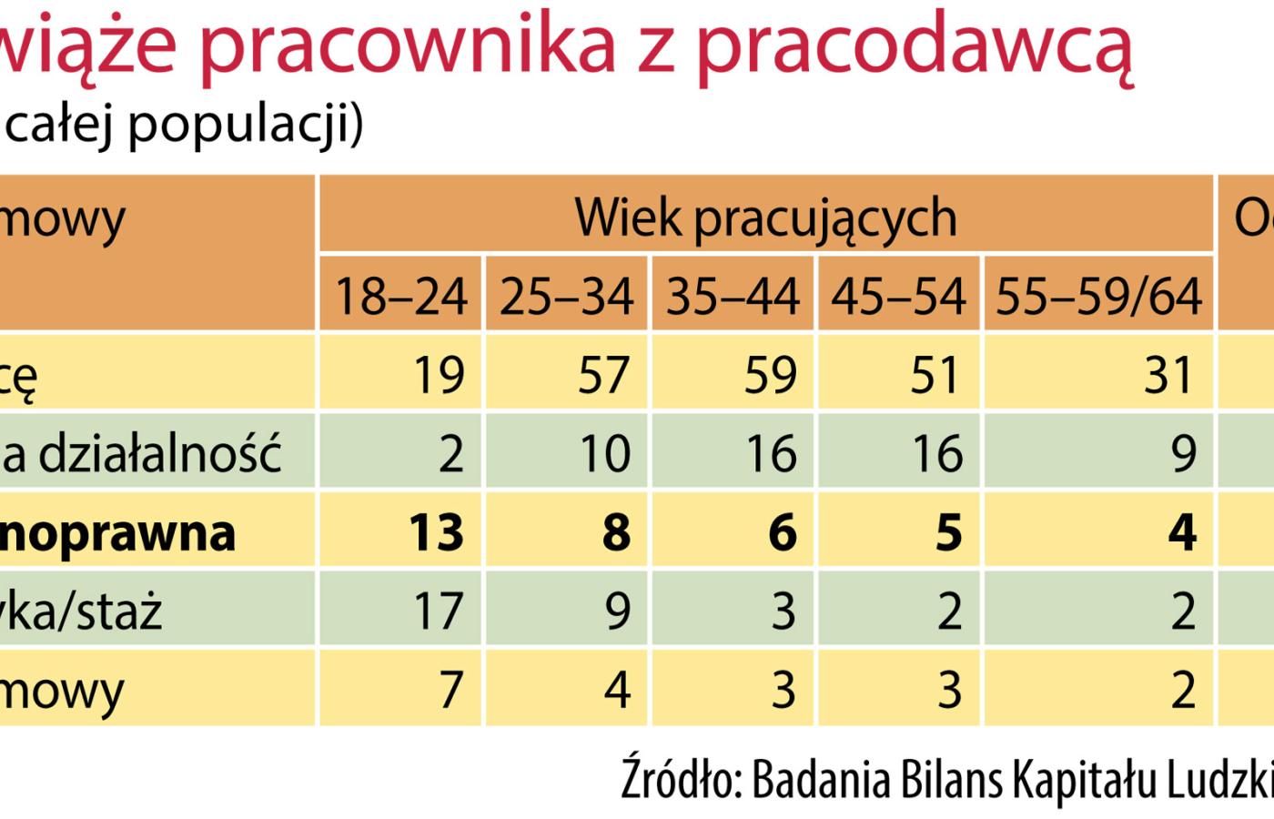 Budzące sporo kontrowersji umowy cywilnoprawne są dziś podstawową formą zatrudnienia dla coraz większej liczby Polaków. Według badań Bilans Kapitału Ludzkiego, przeprowadzanych od kilku lat przez Polską Agencję Rozwoju Przedsiębiorczości, w taki sposób wiąże się z firmą już 13 proc. osób w wieku 18–24 lata, ponad 8 proc. w przedziale 25–34 lata i 5 proc. czterdziesto- i pięćdziesięciolatków (patrz tabela na s. 39). Czy ta duża grupa ludzi bez etatu, a więc „bez stałego zatrudnienia” ma szansę na kredyt?