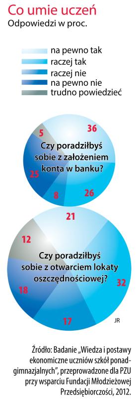 Według przeprowadzonych w ubiegłym roku badań Fundacji Kronenberga, zaledwie 36 proc. ankietowanych potrafi poprawnie powiedzieć, ile wyniosą odsetki sześciomiesięcznej lokaty w wysokości 1 tys. zł, na 6 proc. w skali roku. Aż jedna piąta uważa, że nie da się tego z góry określić, a 13 proc. jest przekonanych, że mogą nic nie dostać, jeśli bank źle zainwestuje ich pieniądze. Według badań TNS OBOP sprzed pół roku, czyli już po aferze Amber Gold, aż 40 proc. Polaków nie wiedziało, co to jest parabank, a o Bankowym Funduszu Gwarancyjnym słyszało zaledwie 37 proc. badanych. Pozostaje mieć nadzieję, że obecne nastolatki w skomplikowanym świecie pieniądza odnajdą się o wiele lepiej niż ich zagubieni i niedoinformowani rodzice.