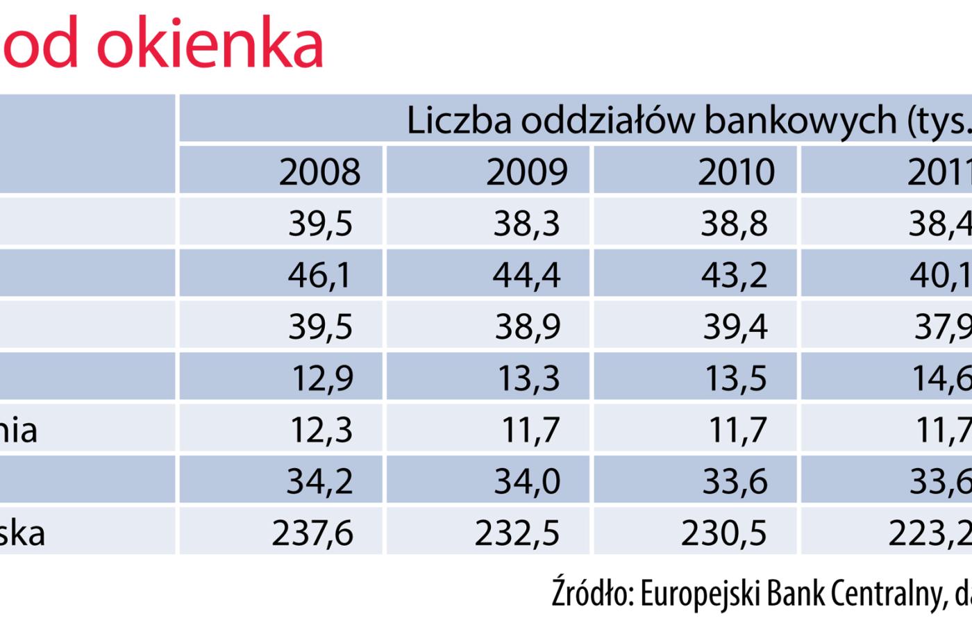 Do tej pory narzekaliśmy raczej na bezpardonowe zawłaszczanie przez banki ulic i placów w centralnych punktach dużych miast. Warszawa była tu szczególnie niechlubnym przykładem. Z danych Komisji Nadzoru Finansowego wynika jednak, że okres największej tego rodzaju ekspansji mamy już za sobą. Polska, wciąż nadrabiająca opóźnienia w rozwoju bankowości, na razie nie przeszła jednak do fazy ograniczania liczby oddziałów. W sumie jest ich u nas nieco ponad 15 tys. (nie licząc agencji), z czego ok. 3 tys. to placówki partnerskie, zazwyczaj działające na zasadach franczyzy.