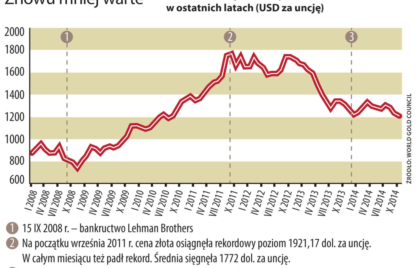 Pierwsza i chyba najbliższa prawdy odpowiedź jest taka, że po prostu w rekordowym 2011 r. cena kruszcu została wywindowana do niespotykanego i nieracjonalnego poziomu (w absolutnym szczycie było to ponad 1920 dol. za uncję!). Od tego czasu, z krótkimi przerwami, trwa korekta, bo część ówczesnych założeń dotyczących światowej gospodarki i poczynań najważniejszych graczy na tym rynku okazała się błędna. Dla jednych to tylko pouczająca lekcja ekonomii, dla innych całkiem duże i wymierne straty.