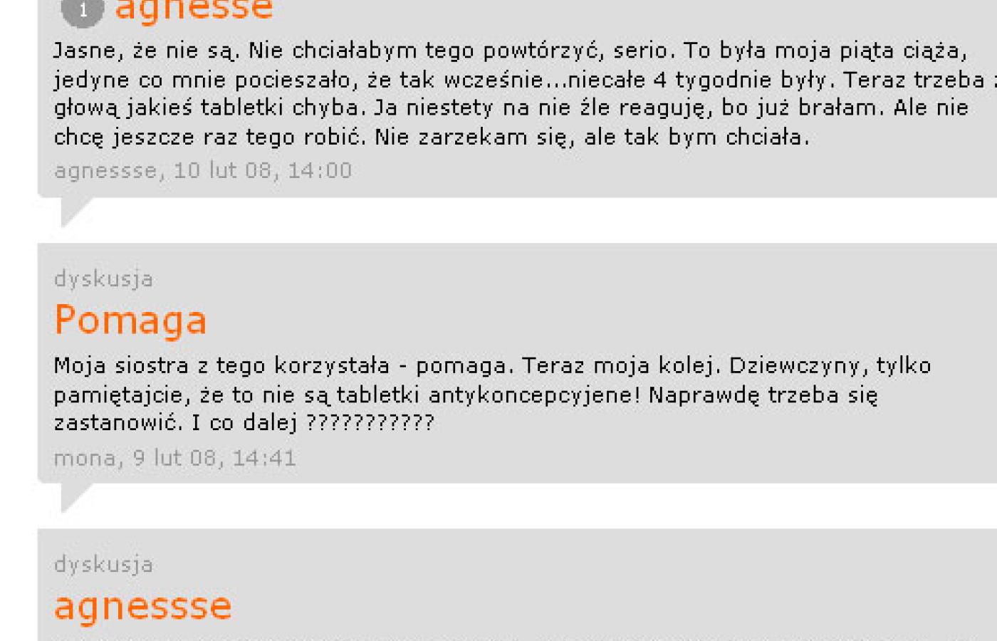 Ciągle była w kontakcie z ludźmi, których poznała podczas poszukiwań w sieci. Któregoś dnia odezwała się Jowita. Podała adres i powiedziała: Wejdź tam i zobacz, co zrobiłam. Utworzyła forum do bezpiecznego pogadania. Jowita jest bardziej od spraw komputerowych. Julia od ludzkich. Bo po tym strasznie chce się wygadać. A w realu się nie da. W Polsce nie rozmawia się o aborcji, nawet z bliskimi koleżankami. Słowa: „usunęłam ciążę” nie przechodzą przez gardło. A Internet daje anonimowość, tu można swobodnie powiedzieć: zrobiłam to, czuję niesamowitą ulgę i nie mam żadnych wyrzutów sumienia. Wciągnęło ją to maksymalnie. Wchodziła do sieci po 30 razy dziennie; w domu, w pracy. Bywało, że miała naraz otwarte po trzy okienka na Gadu-Gadu. Jedna chce wiedzieć, jak zrobić zagraniczny przelew, druga zwymiotowała 15 minut po połknięciu proszków, trzecia pyta, czy może podać adres chłopaka, bo nie wie, jak wytłumaczyć rodzicom przesyłkę z Holandii. Zaczęło jej to pochłaniać całe życie. Ale szybko okazało się, że forum samo się kręci. Dziewczyny, które są po, chcą pomagać tym przed. Wytworzył się nawet język forum. Nowa użytkowniczka to świeża krew, komplet tabletek – M&M’sy, mizo, mife, misiu – nazwy konkretnych specyfików. Zazwyczaj świeża krew chce najpierw konkretnie wiedzieć: co, jak, gdzie i za ile. Potem tydzień czekania na przesyłkę to czas gadania, uspokajania, słuchania cudzych historii i upewnienia, że któraś będzie na forum, kiedy weźmie tabletki.