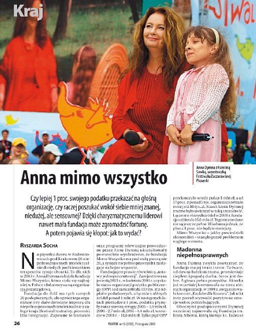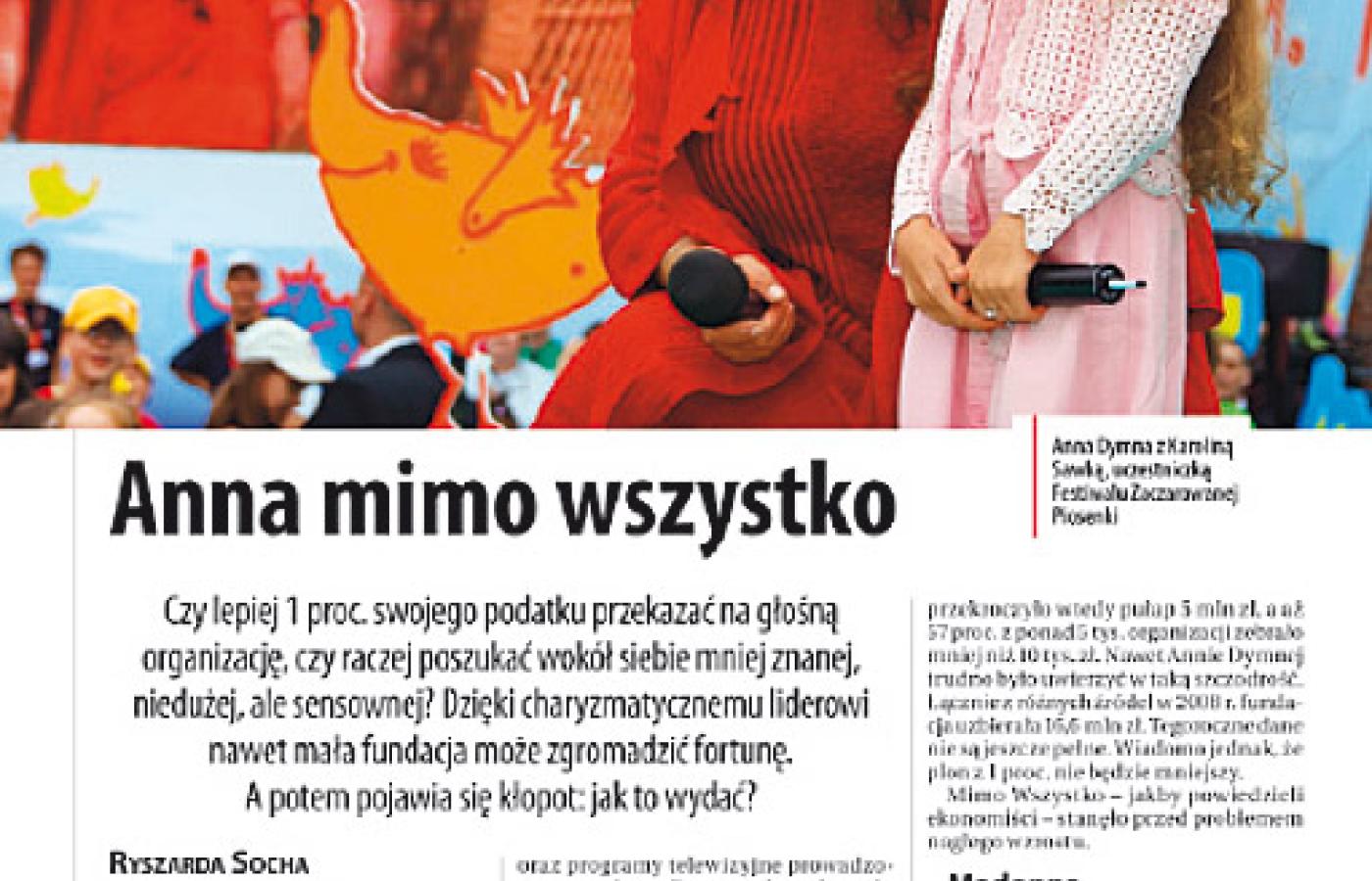 W Tygodniku „Polityka” z dnia 7 listopada 2009 r. nr 45 (2730) ukazał się artykuł pt. „Anna mimo wszystko” na temat działalności Fundacji Anny Dymnej „Mimo Wszystko”, autorstwa Pani Ryszardy Sochy. Pani Redaktor zawarła w nim szereg nieprawdziwych i zmanipulowanych informacji, sugeruje między innymi, że: