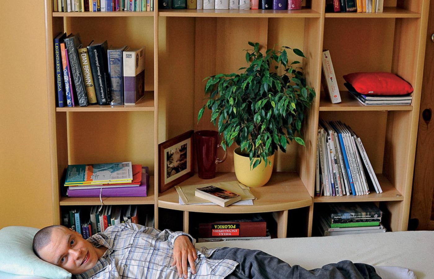Tomek potrafi się podpisać tylko w pozycji leżącej. Stawia duże, roztrzęsione, drukowane litery. Żeby podpisać umowę z PFRON, musiał osobiście stawić się w biurze. Tam nie było się gdzie położyć, więc postawił jakąś koślawą parafkę. Jechał w tym celu z Bielska-Białej do Katowic. Przed biurem PFRON są dwa miejsca parkingowe dla niepełnosprawnych. Akurat były zajęte. Musieli pokonać w deszczu kilkaset metrów. Poprzednio urzędnik przyjechał do niego do domu. Dlaczego tym razem nie mógł?