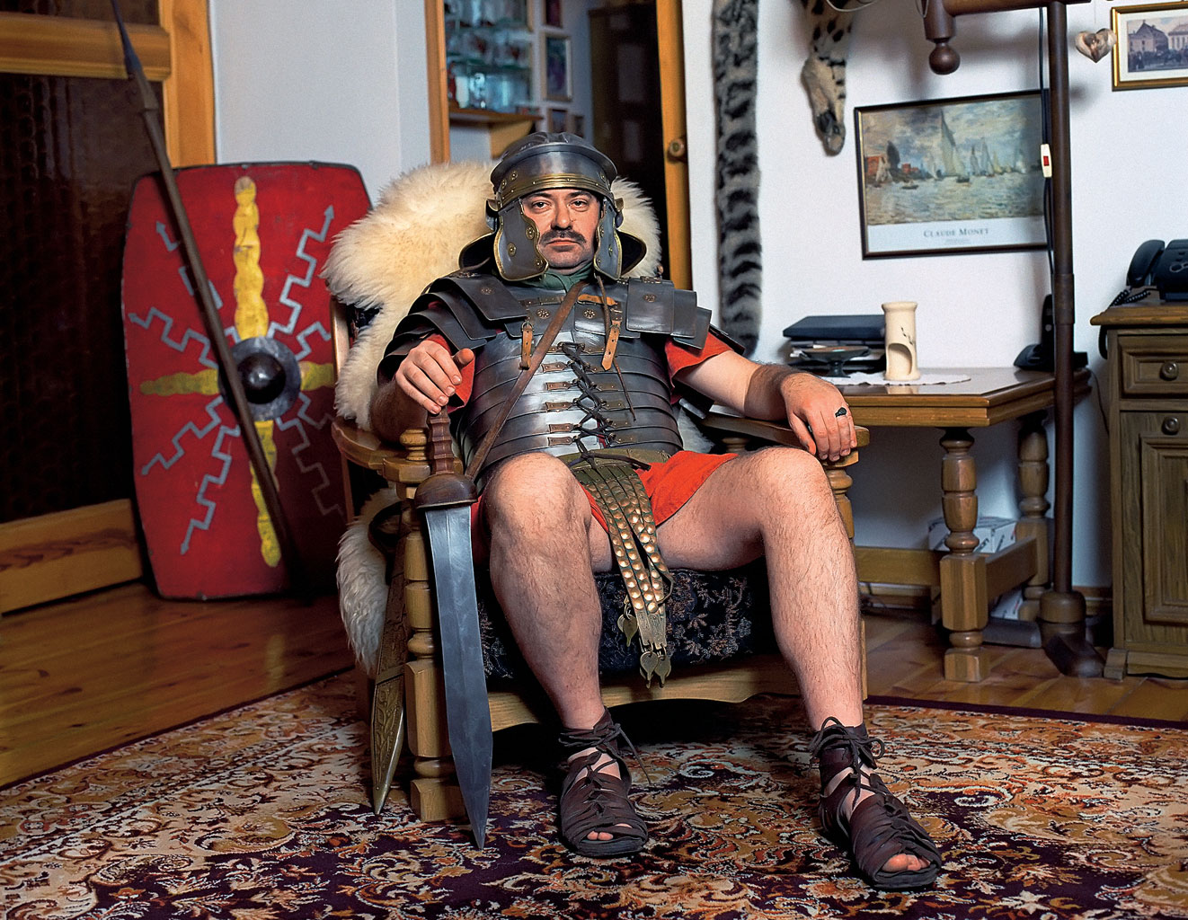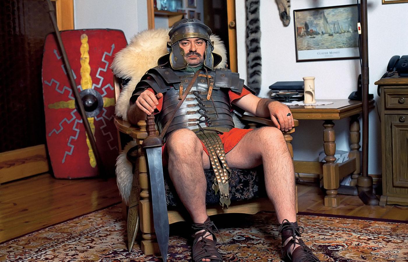 W jego domu, za sklepem, w korytarzu i jednym pokoju – prywatne muzeum starożytności. Na ścianach plany antycznego Rzymu, fotografie popiersi cesarzy. Na regałach wykonane przez gospodarza miniatury bitew stoczonych przez legiony rzymskie i kolekcja monet z epoki. W jednym rogu drewniana tarcza i oszczep z jesionu, w drugim cornicer, róg sygnałowy, replika kupiona we Francji. W centralnym miejscu lorica segmentata, 30-kilogramowa zbroja. Zrekonstruowana dokładnie według oryginału z I w., odkopanego w Brytanii obok wału Hadriana. Wykonana jest z blachy brązowej, w zakładzie w Imielinie, jedynym, który potrafił to zrobić takimi metodami, jakimi wykuwano zbroje 2 tys. lat temu. Hełm wykuty jest z jednego kawałka blachy. Bez spawania, którego wówczas nie znano. Pod stojakiem ze zbroją, sandały. – Są zrobione jak kiedyś, z jednego paska skóry. Legionista dostawał parę raz na sześć miesięcy. Ja używam ich od sześciu lat. Nacieram oliwą, skóra jest gładka i nigdy nie ociera stóp – opowiada pan Robert.