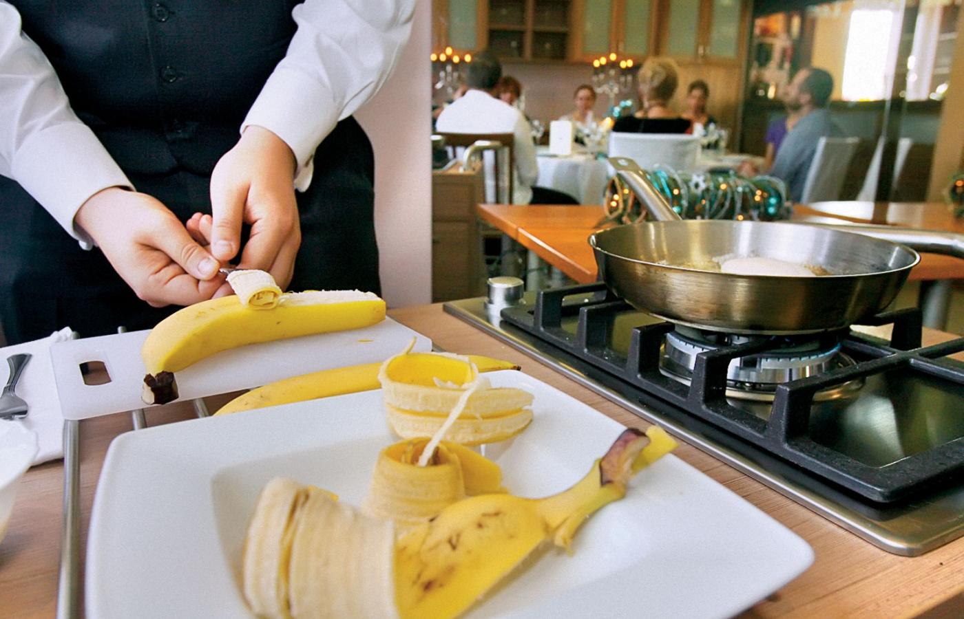 W Słupsku podziwiamy kelnera Mateusza podczas obierania banana. Obierany owoc nie ma kontaktu z jego dłońmi, jedynie ze sztućcami. Ląduje na patelni lekko podlany brandy. Mateusz serwuje deser w pozycji wyprostowanej, z ręką za plecami, z prawej strony konsumenta. Dużo tutaj ćwiczę – mówi i zerka na ścianę luster, w jakie wyposażona jest pracownia obsługi klienta. Koryguję sylwetkę kelnerską – wyjaśnia pan Daniel, nauczyciel technologii gastronomicznej. Klatka piersiowa do przodu – demonstruje pan Daniel – choćby ze względu na BHP.