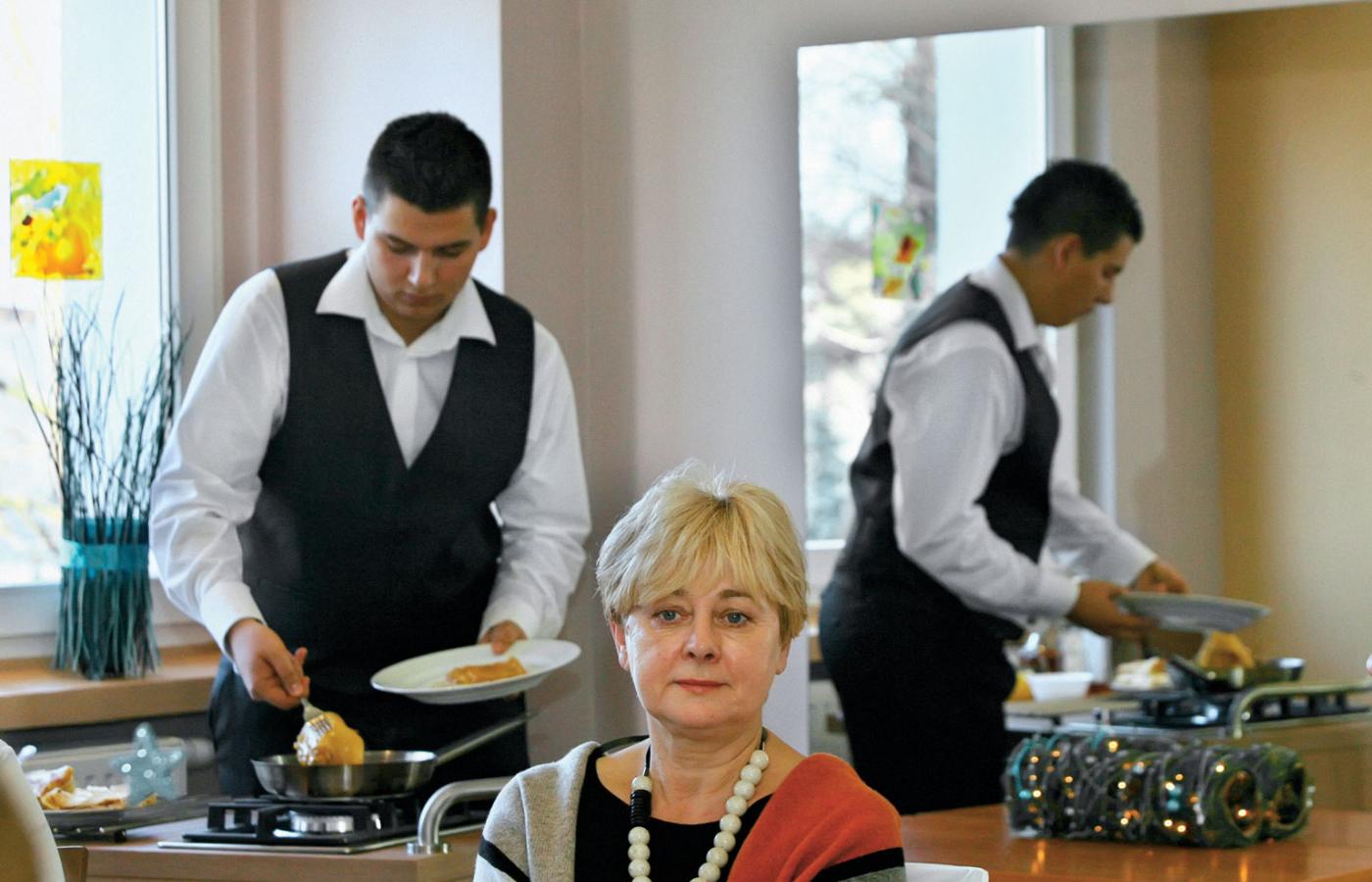Lubię ludzi – mówi Mateusz, serwując naleśniki przy jednoczesnym korygowaniu wzrokowym postawy w lustrach pracowni obsługi klienta. Grzegorz, który jest w klasie kucharskiej, lecz – jak zauważa dyrekcja szkoły – od buta po uśmiech sugeruje powołanie do kelnerstwa, wybucha: Kontakt z ludźmi daje mi tyle radości, tyle radości!