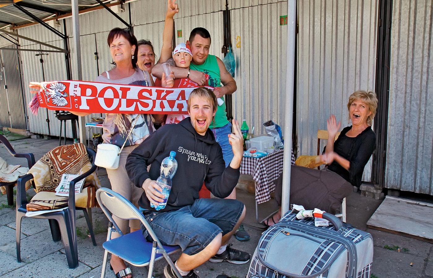 Ta strefa to dzięki państwu Frączakom. Prowadzą obok sklep spożywczy. Jako jeden z niewielu ostał się w okolicy. Duże markety wykończyły konkurencję. – Mamy stałych klientów, od lat nas odwiedzają. Teraz jest taki czas, niech się wszyscy cieszą – mówi pani Frączak, wydając stałemu klientowi piwo mocne Śląskie. W strefie jest wystrój, jak trzeba – drewniane ławy i stoły, flaga i biało-czerwony szalik. „Wszyscy jesteśmy drużyną narodową”. Na środku miejsce na ekran. Na razie puste. Telewizor z domu państwa Frączaków wjeżdża dopiero po 17. Plazma, 42 cale albo i więcej, zakrywa napis, że „Monika R. to suka”. Plazmę z kolei ochrania przykręcana pleksa. Jeden małolat rzucił w telewizor butelką. Trzeba uważać.