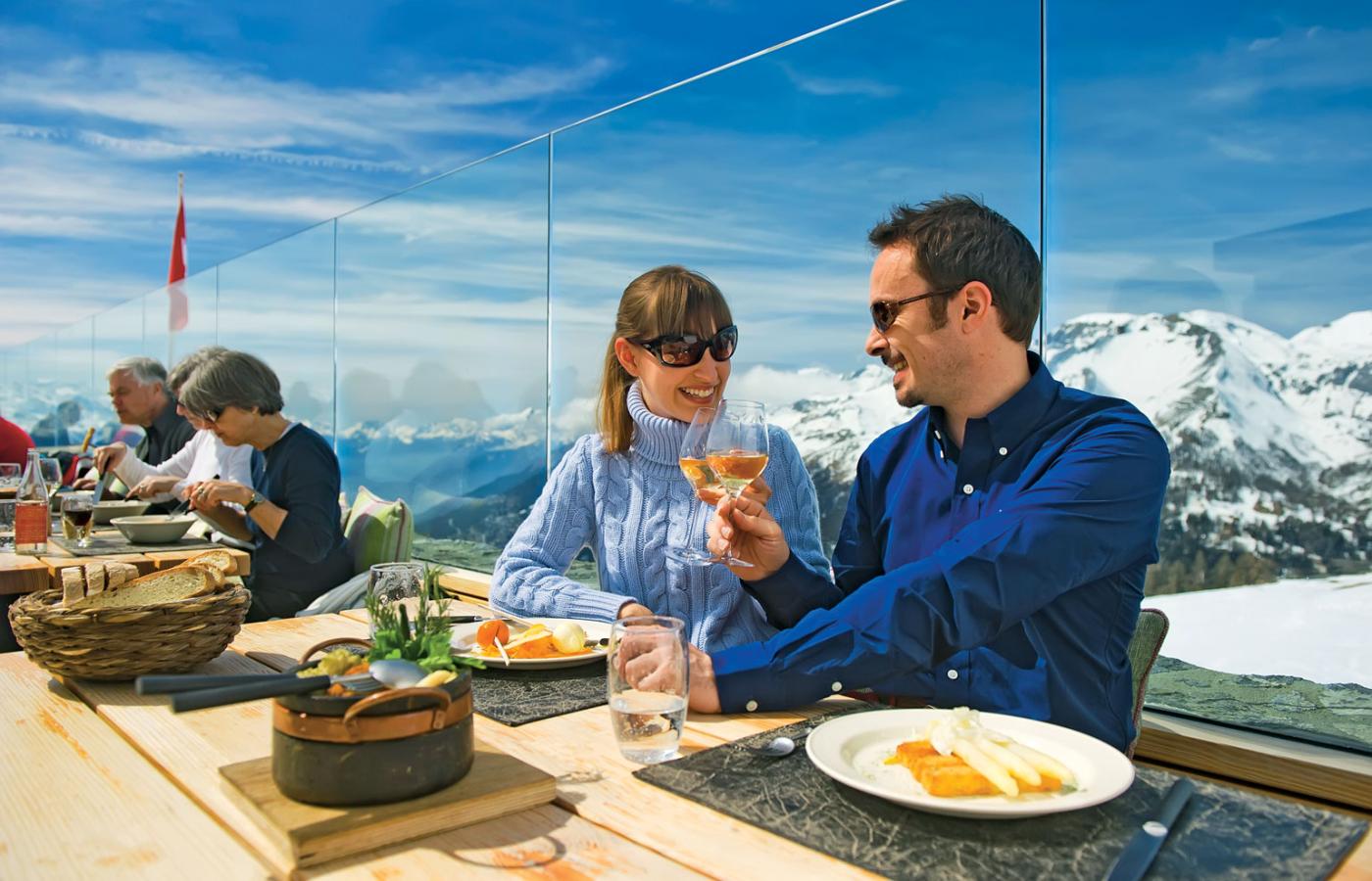 Wyjątkowość nart w Crans Montana polega wreszcie na tym, że tu się je celebruje. Bywalcy, przykładowo, nie sprowadzają przerwy na posiłek do pospiesznego wchłonięcia zupy bądź talerza makaronu i wypicia kufla piwa. Dla nich oznacza ona wielodaniową ucztę, najlepiej na tarasie restauracji Chetzeron (2100 m n.p.m.). To zaadaptowana do nowej roli górna stacja dawnej kolejki linowej – z nowoczesnym, acz eleganckim wystrojem. Klasę trzyma także obsługa, o kuchni nie wspominając. Nie bez powodu krytycy wymieniają Chetzeron wśród najlepszych górskich restauracji Alp. Prócz stałego menu chef codziennie sugeruje inną swoją specjalność bazującą na tradycji.