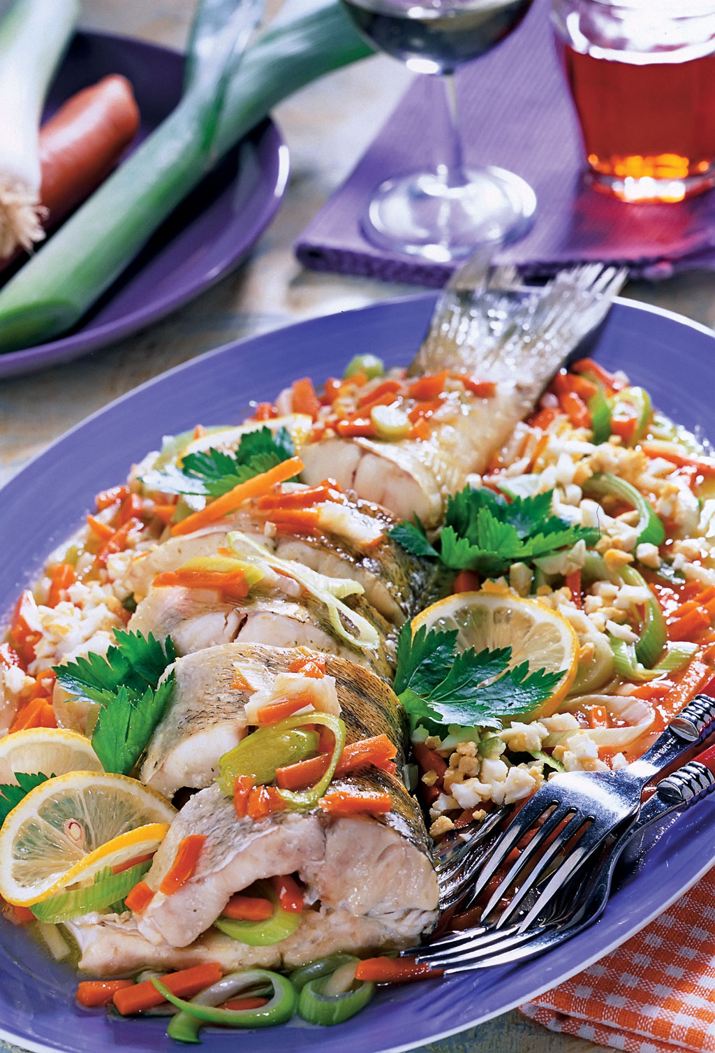 1,5 kg ryby, 35 dag warzyw (marchew, pietruszka, seler, por), 4 jaja, 2 łyżki masła, liść laurowy, 2 ziarna ziela angielskiego, 2 ziarna pieprzu, sól, natka pietruszki