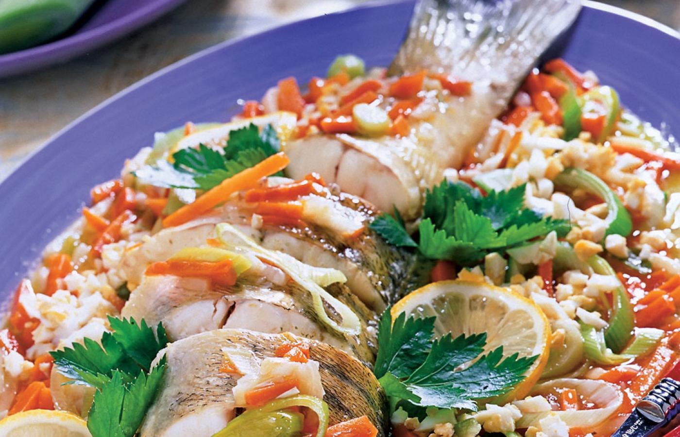 3 Gdy warzywa zmiękną, dodać dzwonka sandacza, przykręcić ogień i gotować 15–20 minut.