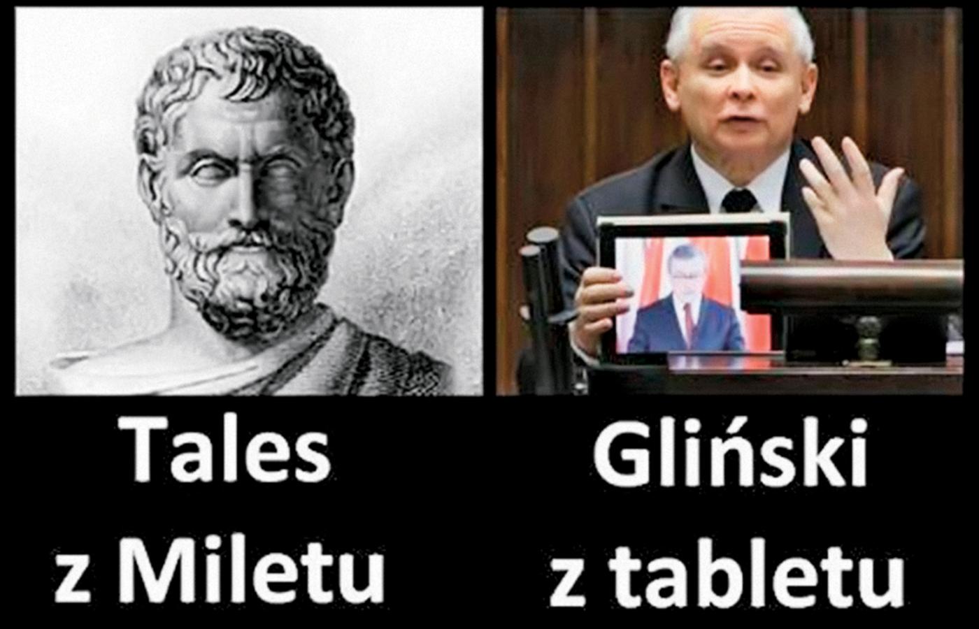 Omijanie konstytucji czy fortel godny Zagłoby – niech rozstrzygają inni. Najważniejsze, że w konkursie na najbardziej memotwórczego polityka tygodnia prezes Kaczyński w ostatniej rundzie pokonał przez nokaut prowadzącego na punkty Stefana Niesiołowskiego, chociaż polityk PO był na szczawiowym dopingu. Co ciekawe, twórcy przeróbek Jarosława z Tabletem podzielili się na jego zwolenników i przeciwników, ale jakoś nikt nie docenił wkładu profesora Glińskiego. Czyli w tym przypadku nie sprawdziła się stara medialna zasada, głosząca, że content is king (w wolnym tłumaczeniu: najważniejsza jest treść). A może właśnie się sprawdziła, à rebours? Nawet Tales z Miletu by się w tym pogubił...