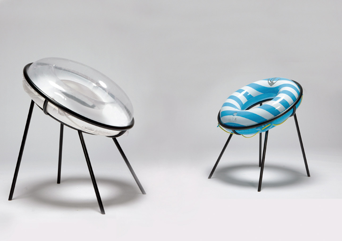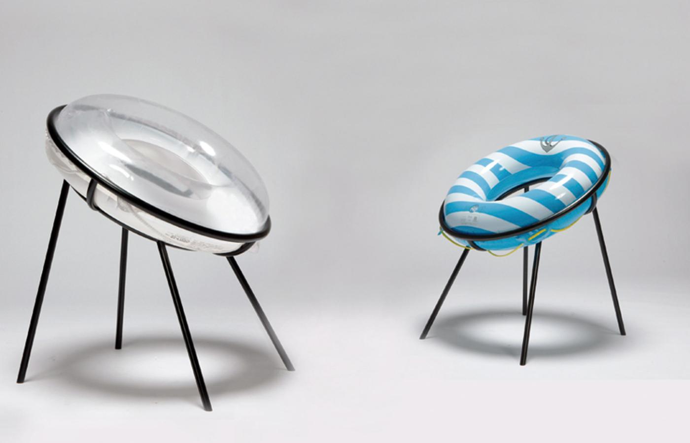 Kto nie mógł w tym roku wyjechać nad lazurowe morze, mazurskie jezioro albo chociaż toń miejskiego basenu, może sobie część doznań odtworzyć w domu. I to na sucho. Wystarczy zaprosić do pokoju krzesło Ukiwa, choć na pozór wyglądem nie zaprasza. Żelazną ramę, zaprojektowaną przez Japonkę Sachiko Fukutomi, trzeba obłaskawić nadmuchiwanym kołem plażowym. Oponka zapewni nam komfort, będzie też skrzypieć przy każdym siadaniu i wstawaniu, zapowiadając godziny dryfowania po sztucznych i naturalnych akwenach. Bo gdy już za rok nadejdzie odpowiedni czas, wystarczy spuścić z niej powietrze i spakować do walizki.