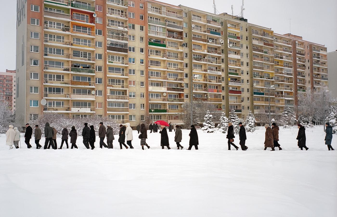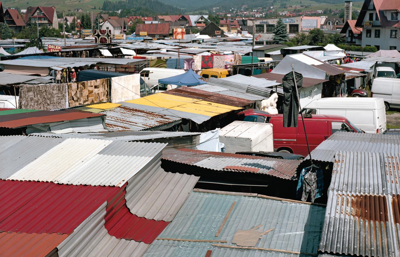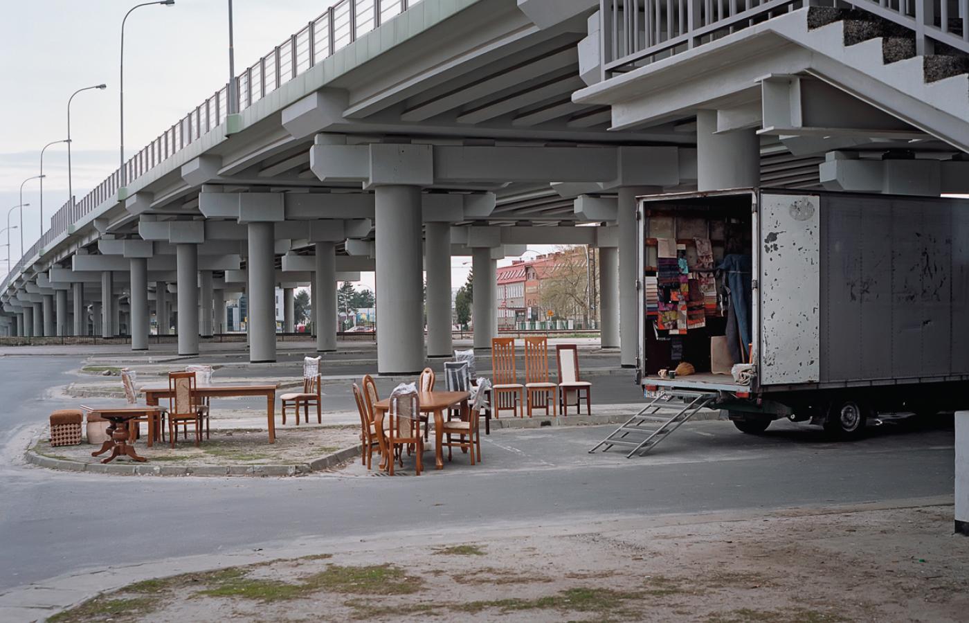 Czasem trzeba się zatrzymać, wysiąść na najbliższym przystanku i kawałek cofnąć, by sprawdzić, czy to, co się zobaczyło przez szybę, jest warte rozstawiania statywu. Zwykle jest. Niekiedy rzuca go przez przypadek w jakiś odległy kąt miasta. Znajduje tam cmentarzysko budek telefonicznych albo prowizoryczne stoisko z meblami sprzedawanymi wprost z ciężarówki ustawionej pod jakimś wiaduktem. Bywa, że trafi się koczowisko bezdomnych – materac, jakieś stare kołdry i para męskich klapek, ustawionych porządnie obok legowiska. Albo dzieciaki spędzające wolny czas w zniszczonej hali jakiegoś dworca. Paździerz przenika się z tekturą, nowe ze starym, śmieci z kostką Bauma, miasto ze wsią. Między tym wszystkim trochę ludzi, ale zwykle nie na pierwszym planie, trochę przy okazji. Zauważa, że często, gdy podnosi aparat do oka, ludzie pytają, co w nich takiego śmiesznego, że robi im zdjęcia.