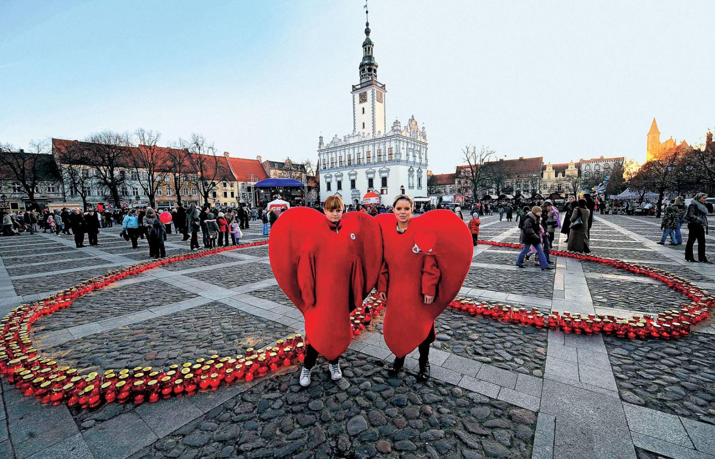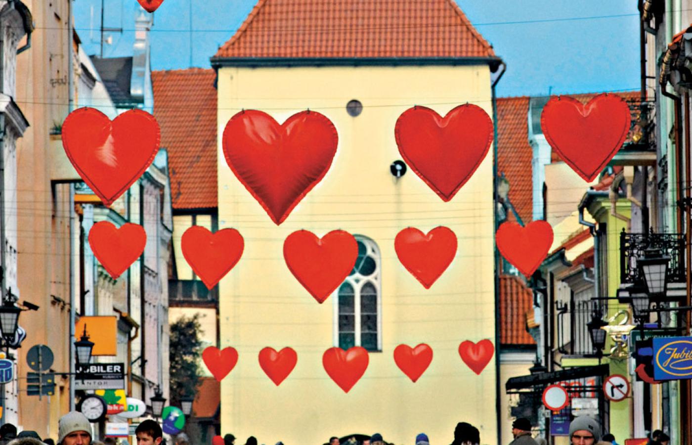 50 km na północ od Torunia leży miasteczko Chełmno, które od około dwóch tygodni wizerunkowo, stylistycznie i w zgodzie z lokalną tradycją przeniosło się w rzeczywistość w odcieniu czerwonym. Czerwone są serca i napis „Walentynki” zawieszone na froncie zrewitalizowanego ratusza. Na czerwono świeci się serce, które zdobi nowoczesną fontannę na rynku, postawioną niedawno za unijne dotacje. Czerwone serduszka-poduszki leżą w przeciwsłonecznych okularach pod palmami na witrynie Magictexu, sklepu z pościelą, i podobne są naprzeciwko, na wystawie salonu fryzjerskiego U Kasi – z wąsami, wycięte w styropianie, ułożone między fryzjerskimi głowami ze spryskanymi czerwonym brokatem lokami, ostatnim krzykiem lokalnej mody. Czerwone plakaty zachęcają mieszkańców do udziału w 14 już walentynkach organizowanych przez Urząd Miasta w Chełmnie – mieście zakochanych lub miłości, właściwie wszystko jedno, nazwy można stosować wymiennie, od kilku lat obie są zastrzeżone.