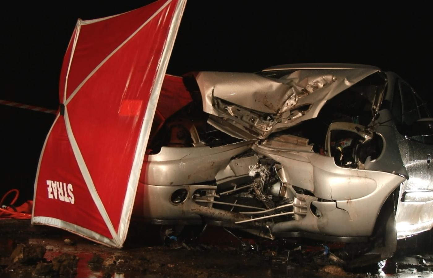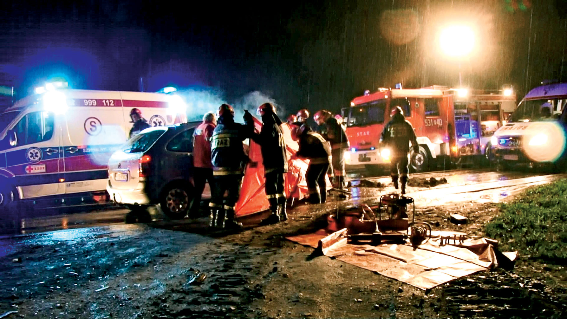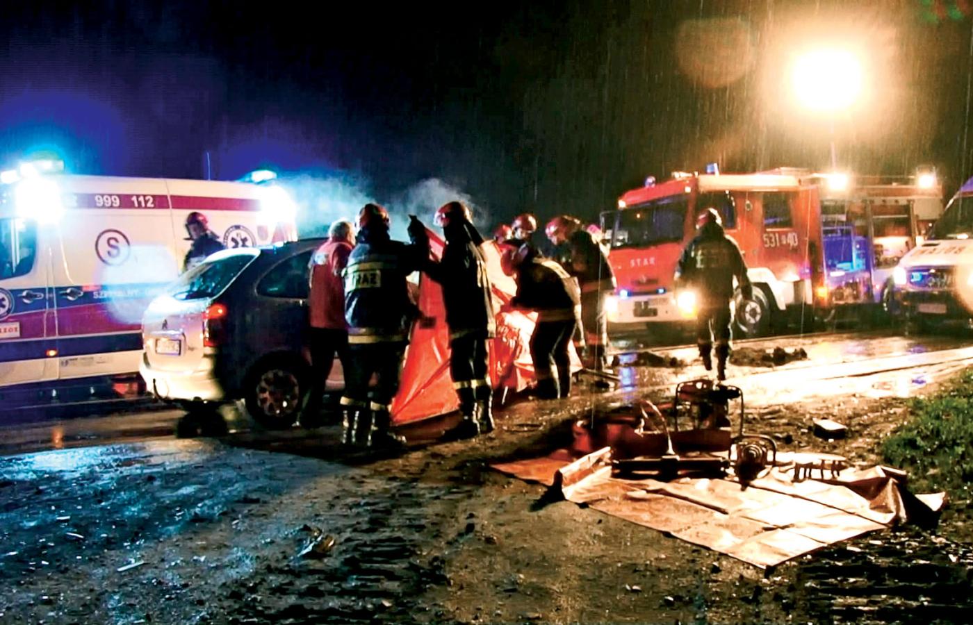 Citroën – jak wyliczyli potem biegli – jedzie w tym momencie z szybkością ok. 60 km na godz. Dlaczego 20-latka za kierownicą w porę nie dostrzega na jezdni przeszkody? Może w deszczu nie odróżnia ciemnej maszyny od tła, może jej uwagę coś na moment odwraca. Koparkę zauważa natomiast siedzący po jej prawej stronie pasażer. Mówi: uważaj!, ale jest już za późno. Dziewczyna zaczyna hamować, bez skutku. Auto uderza w bok pojazdu na gąsienicach, odbija się na dwa metry, zatrzymuje się. Koparka sunie dalej. Zatrzymuje się po przejechaniu jezdni, na poboczu. Kierujący nią czterdziestoparoletni Jerzy C. wyskakuje z kabiny i ucieka.