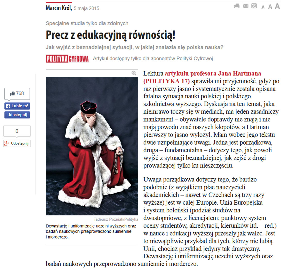 W odniesieniu do artykułu Marcina Króla „Precz z edukacyjną równością!” (POLITYKA 19) chciałbym wyjaśnić, że nieprawdą jest, jakoby Europejska Rada do spraw Badań Naukowych (European Research Council, ERC) finansowała międzynarodowe zespoły naukowców. Wręcz przeciwnie, konkursy ERC, o których pisze prof. Król, są otwarte wyłącznie dla indywidualnych naukowców, związanych z jedną instytucją badawczą. Konkurencja jest bardzo duża (tylko ok. 10 proc. wniosków zostaje sfinansowanych), a projekty oceniane są przez wysokiej klasy międzynarodowych ekspertów. Autor artykułu był jednym z nich. Jedynym kryterium selekcji jest naukowa doskonałość aplikującego badacza i jego projektu. Projekty muszą być nowatorskie i potencjalnie prowadzić do przełomowych odkryć. Tak silna konkurencja prowadzi czasami do sytuacji, w których nawet najbardziej uznani naukowcy nie otrzymują grantów. Przyczyna tkwi jednak wyłącznie w jakości i metodologii projektu lub braku wystarczających funduszy, pomimo wysokiej jakości projektu, nigdy jednak nie w braku partnerów z innych krajów.
