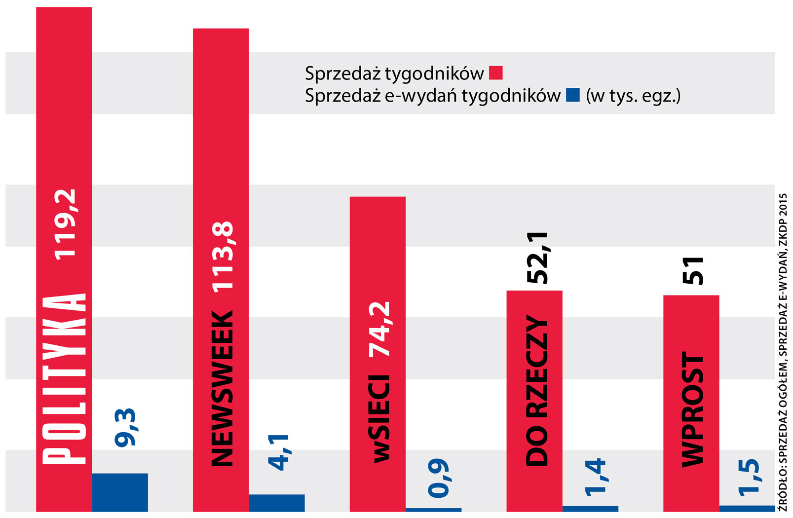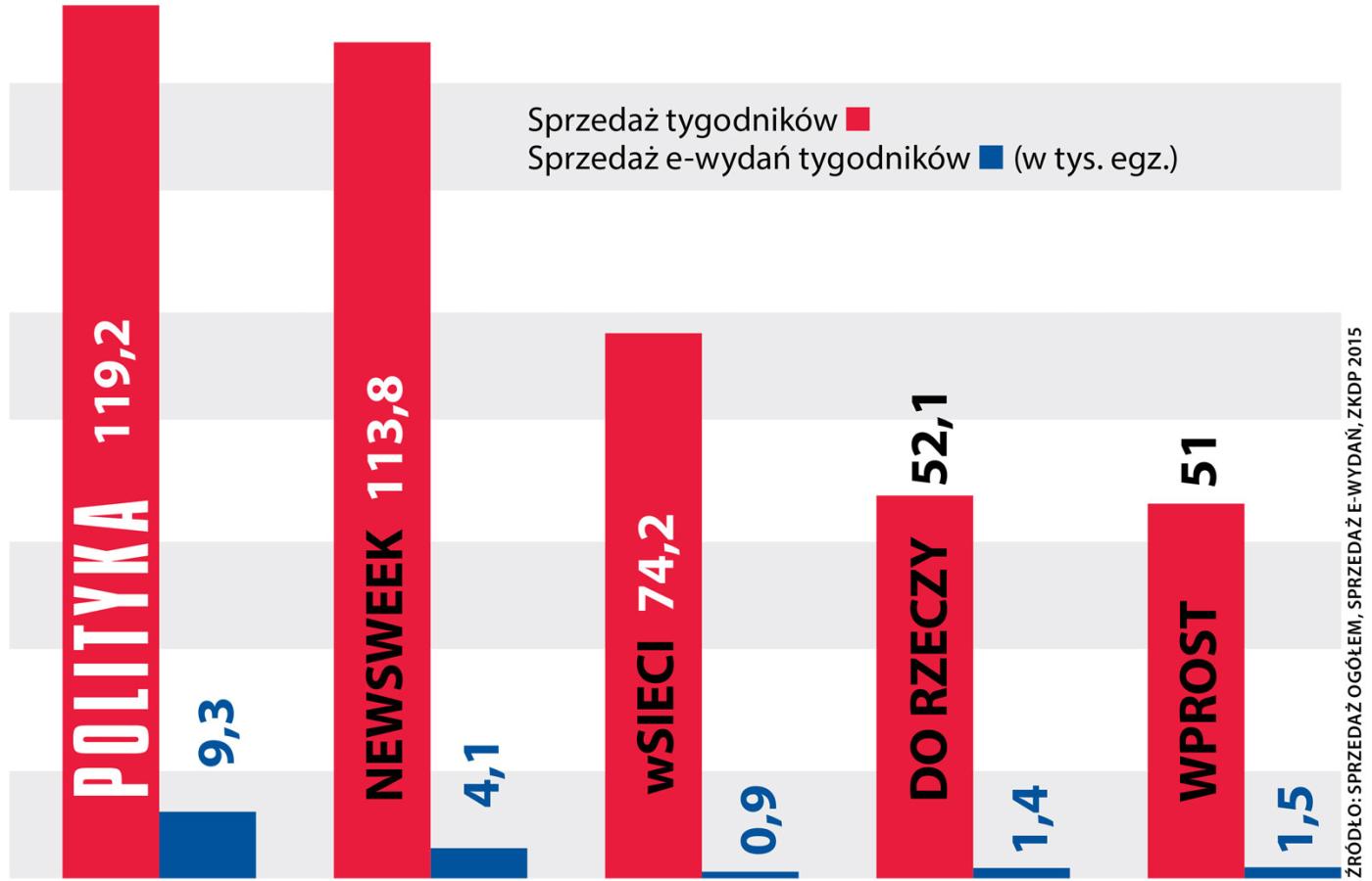 Według najnowszych danych Związku Kontroli Dystrybucji Prasy w pierwszym kwartale 2015 r. POLITYKA odnotowała najwyższą sprzedaż spośród wszystkich tygodników opinii w Polsce. Z wynikiem 119,2 tys. egz. (i wzrostem sprzedaży o 0,5 proc. w stosunku do pierwszego kwartału 2014 r.) POLITYKA była najchętniej kupowanym tytułem w segmencie. Na drugim miejscu – ze średnią sprzedażą 113,8 tys. egz. (i przy spadku wynoszącym 1,9 proc.) – uplasował się „Newsweek”. Sprzedaż pozostałych tytułów spadła poniżej 75 tys. egz. Tygodnik „wSieci” sprzedawał średnio 74,2 tys. egz. (spadek o 6,5 proc.), „Do Rzeczy” – 52,1 tys. egz. (spadek o 21,5 proc.), zaś „Wprost” – 51 tys. egz. (spadek o 0,8 proc.).