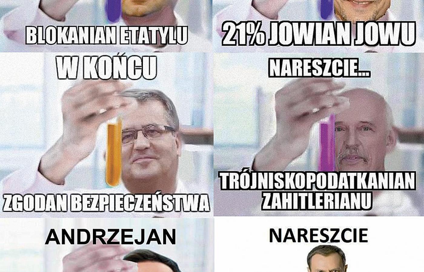 Kampanii wyborczej zawdzięczamy – o dziwo – nowego prezydenta, ale także serię memów, które w zupełnie nowy sposób komentują rzeczywistość polityczną. Oto bowiem w wyniku złożonych reakcji chemicznych otrzymujemy najczystsze destylaty tego, czym żyliśmy przez ostatnie tygodnie. Powyżej – niebezpieczne związki i ich twórcy. A co w tym czasie robił Donald Tusk, który w kampanię przecież się nie angażował? Wiadomo: skraplał angielski.
