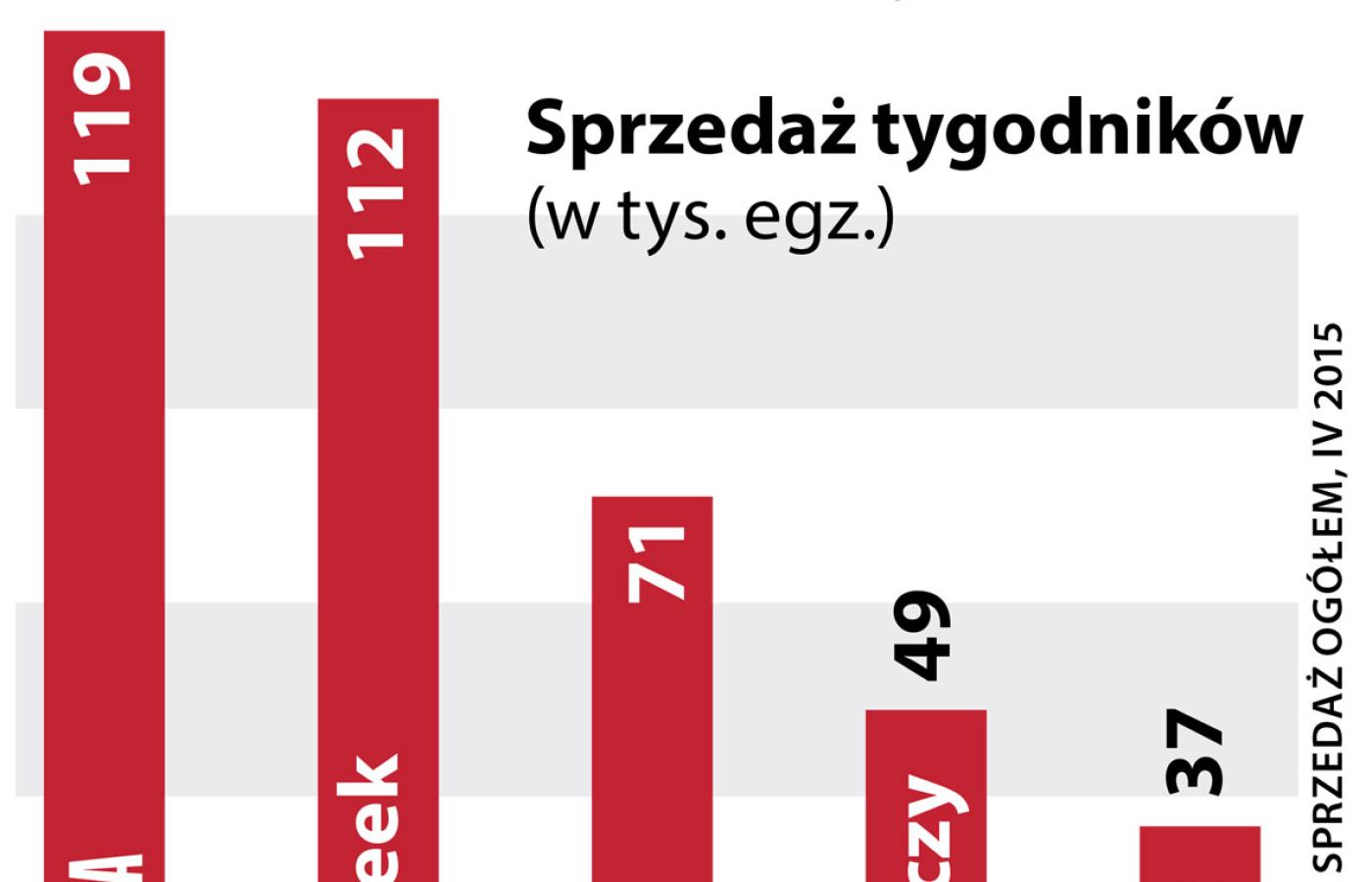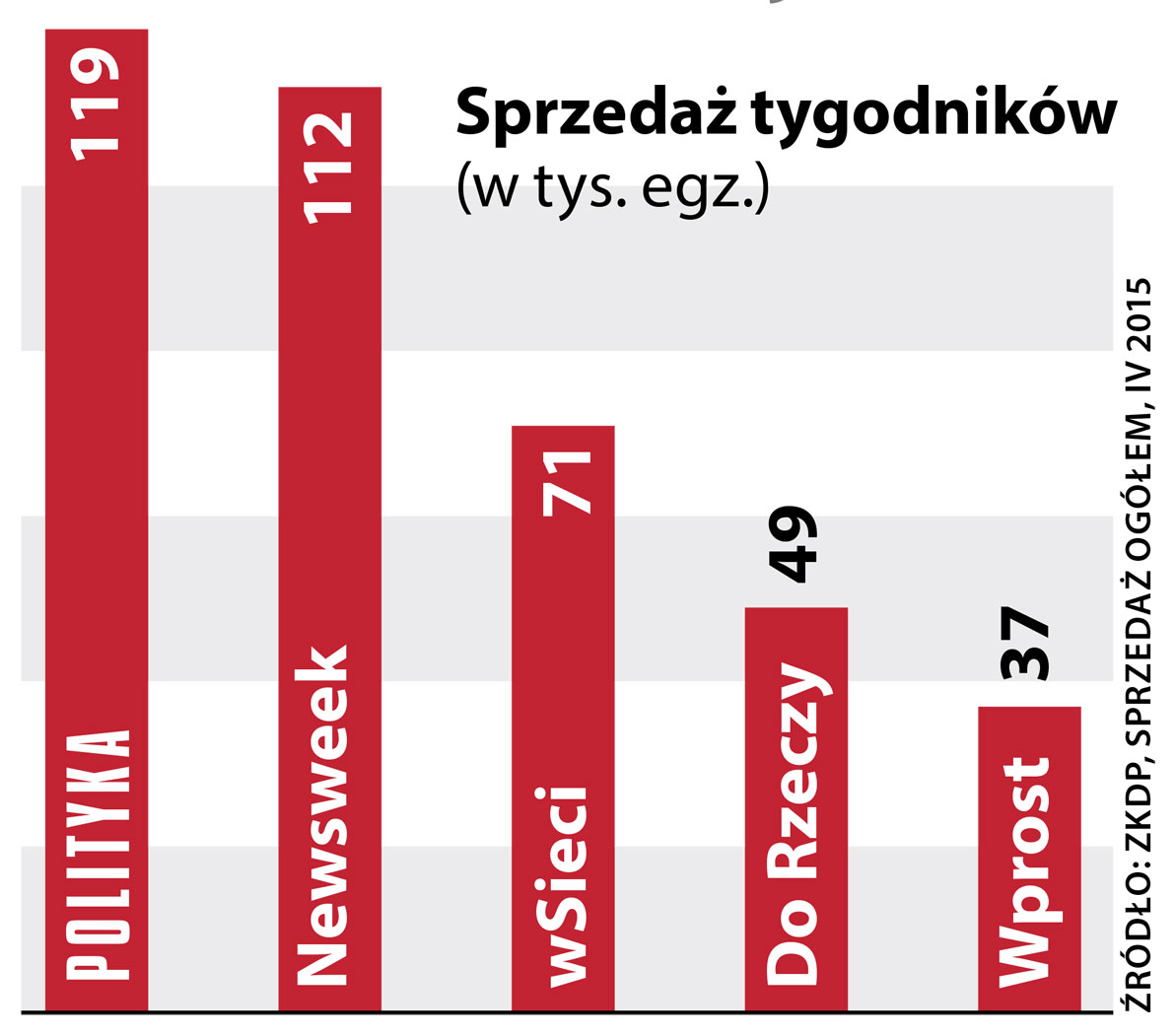 Plasujący się na drugim miejscu zestawienia ZKDP „Newsweek” sprzedawał średnio 112 tys. egz. – czyli o 22 proc. mniej niż w kwietniu 2014 r. Natomiast średnia sprzedaż tygodnika „wSieci” – trzecie miejsce w zestawieniu – wynosiła w tym czasie 71 tys. egz. i była o 12,7 proc. niższa niż rok wcześniej. Pozostałe tytuły, czyli „Do Rzeczy” oraz „Wprost”, sprzedawały odpowiednio: 49 tys. egz. (spadek o 19,5 proc.) i 37 tys. egz. (spadek o 28,5 proc.).