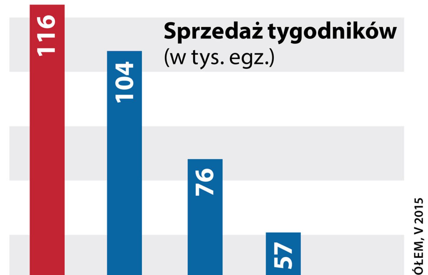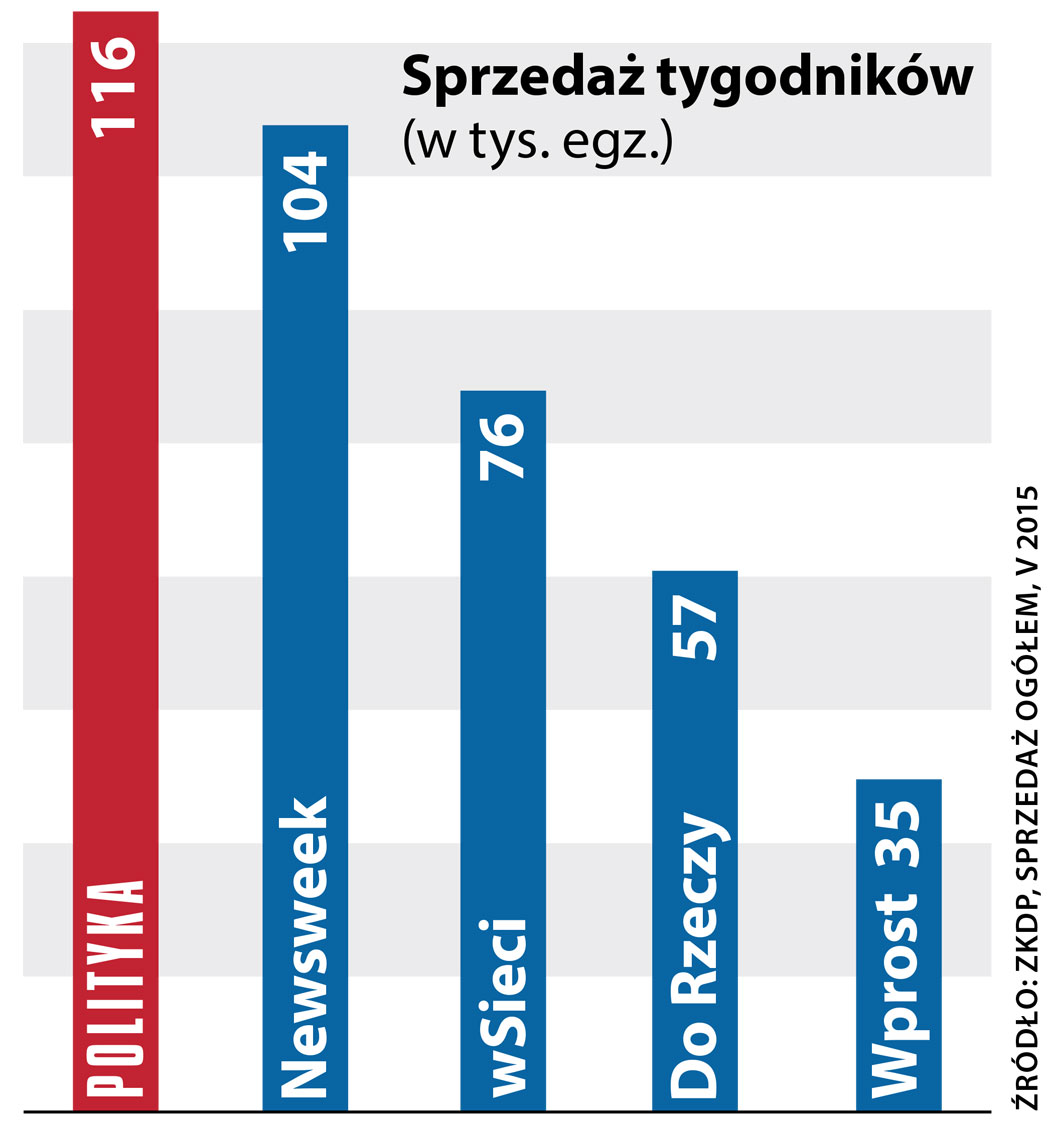 Średnia sprzedaż POLITYKI w maju 2015 r. wyniosła 115,7 tys. egzemplarzy. Na drugim miejscu zestawienia ZKDP uplasował się „Newsweek”, który sprzedawał średnio 104 tys. egz. Na trzecim – tygodnik „wSieci” – ze średnią sprzedażą na poziomie 76 tys. egz. Pozostałe tytuły, czyli „Do Rzeczy” oraz „Wprost”, sprzedawały odpowiednio: 57 tys. egz. i 35 tys. egz.
