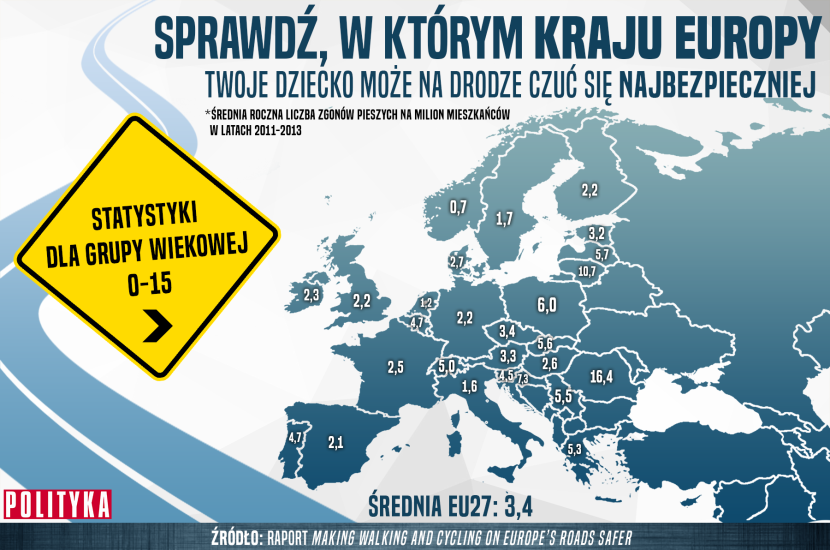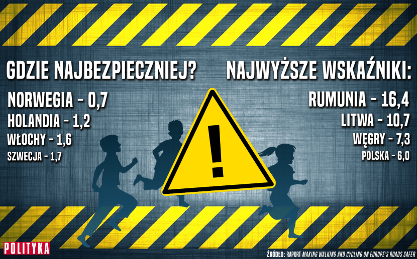 Jak bardzo, widać na poniższych infografikach. Według wspomnianego raportu UE w ubiegłych latach ginęły średnio trzy osoby w wieku 0–15. W Polsce – niemal dwukrotnie więcej, podobnie na Węgrzech. Na Litwie ofiar w tym przedziale wiekowym jest nawet trzykrotnie więcej, w Rumunii – prawie pięciokrotnie.