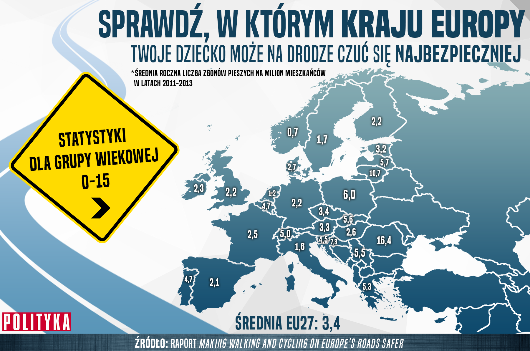 Najbezpieczniej jest w krajach skandynawskich, gdzie rocznie ginie maksymalnie jedna osoba w młodym wieku. Względnie spokojnie jest poza tym na drogach Holandii, we Włoszech i Szwecji. Stosowane w tych krajach rozwiązania mające na celu zwiększenie bezpieczeństwa pieszych uchodzą w Europie za wzorcowe (więcej: tutaj).