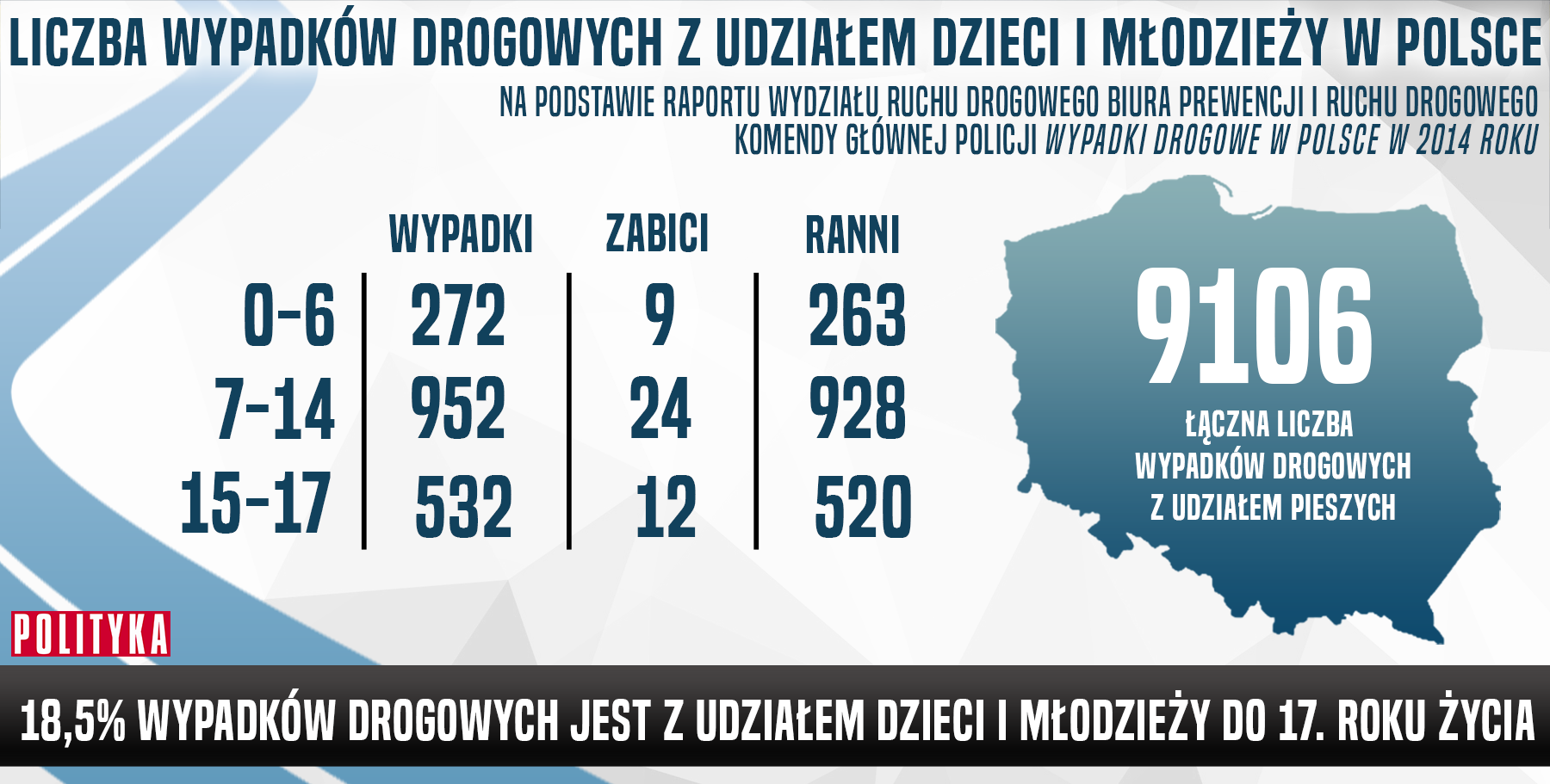 Z policyjnych danych wynika, że w 2014 r. doszło w Polsce w sumie do 9106 wypadków. W 272 przypadkach ucierpiały dzieci w wieku 0–6, w blisko tysiącu – 7–14 lat. Wśród dzieci i nastolatków wskutek wypadków kilkadziesiąt osób zmarło i ponad dwa tysiące zostało rannych.