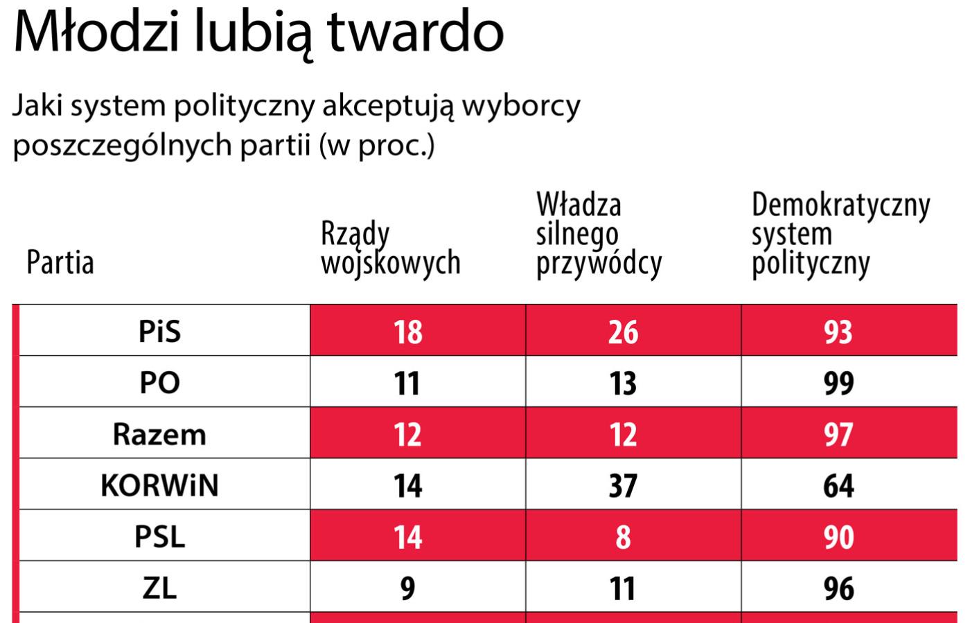 Zdecydowanie wyróżniają się wyborcy KORWiN – wśród nich poparcie dla silnego przywódcy jest dwukrotnie wyższe niż w poglądach ogółu, przy jednoczesnej znacznie niższej akceptacji dla demokracji oraz rządów ekspertów. Także ponadnormatywnie wysokie poparcie dla silnego przywódcy odnajdujemy wśród 25 proc. elektoratu PiS, najniższe zaś wśród zwolenników Nowoczesnej. Najwyższy odsetek zwolenników rządów wojskowych jest wśród wyborców PiS, co razem z dość znacznym wsparciem rządów silnego przywódcy daje obraz elektoratu, którego skłonności do autorytarnych rozwiązań są znaczne. I to w sytuacji, w której elektorat ten dopiero co doprowadził swą partię do władzy środkami demokracji wyborczej.