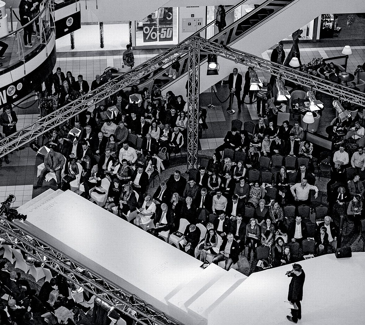 Klientela obserwuje to z ruchomych schodów i galeryjek bizantyjskiego centrum handlu. 12 pretendentek do tytułu Miss Egzotica, różne niepolskie odcienie skóry i oczu, prezentuje się w strojach od sponsorów i porusza zagadnienia marzeń, wiary, geopolityki i kulinariów. Im wyżej się wjedzie, w kierunku strefy gastronomicznej VIP i centrum rozrywki, tym są mniejsze i trudniej zrozumieć, co mówią. W szumie chodzą po wybiegu i przybierają pozy na wysokich obcasach.