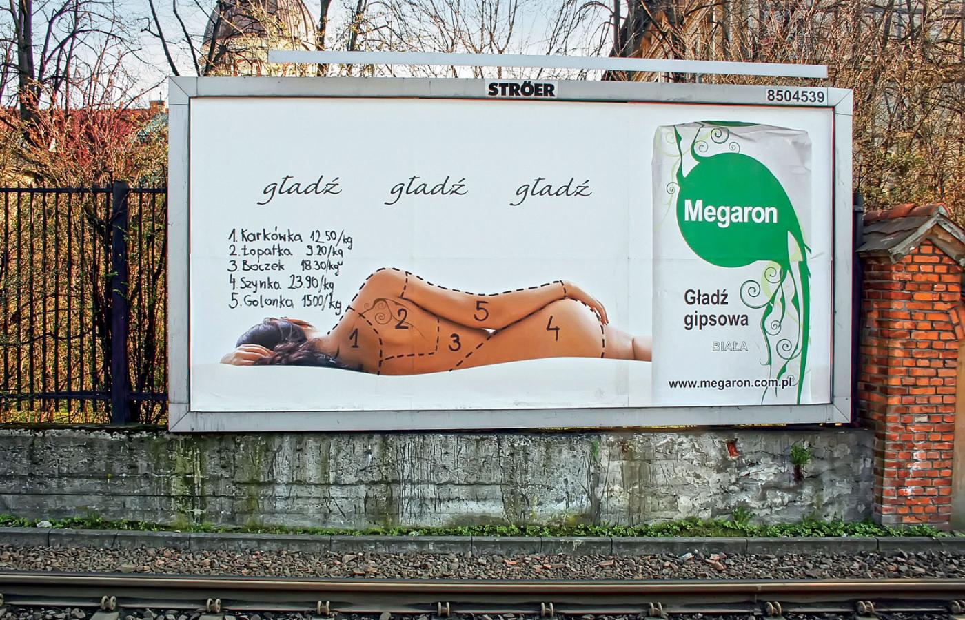 Biust przy betoniarce, zdobiący blachodachówki, pupa ujęta od tyłu na masce samochodu wraz z informacją o usłudze w gratisie czy ciało w bikini na posadzce ubojni drobiu.