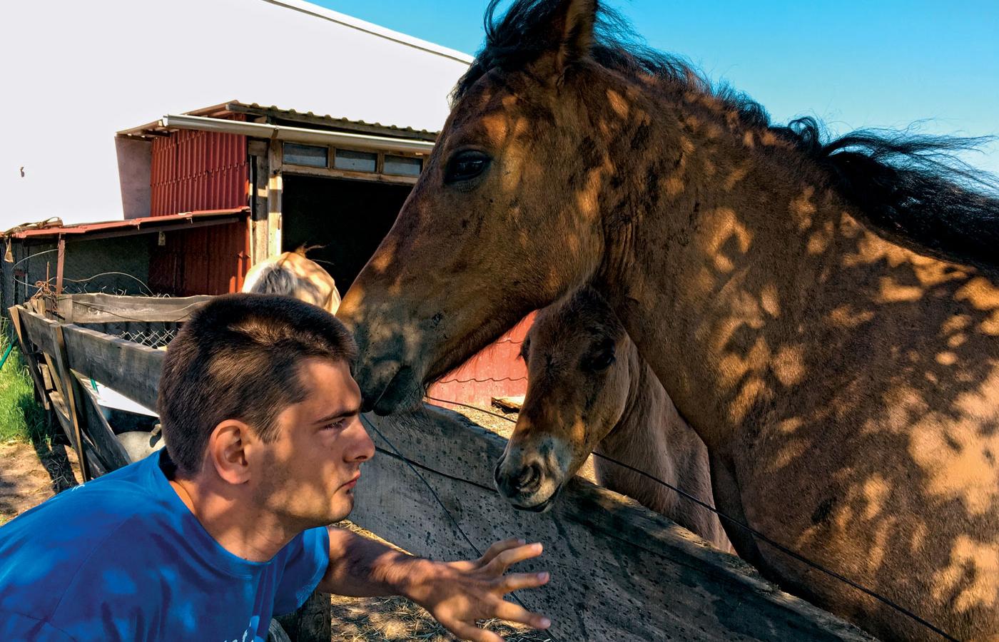 Rano w Górach Jan z mamą Marią ruszają na spacer. Jak zwykle przez klepisko podwórka w kierunku stodoły, potem na ten chodnik z kostki, który tata zbudował specjalnie dla Jana, żeby mógł jeździć do koni po równym. W zagrodzie mieszkają trzy konie, klaczka Natasza, najstarsza, zawsze w ciszy liże wnętrze lewej dłoni Jana. Dzieją się cuda, szorstki i ciepły jęzor przywraca czucie, ręka zgina się i nagle pozwala ułożyć na kole wózka; wtedy Jan sam napędza wózek. Wracają ze spaceru.