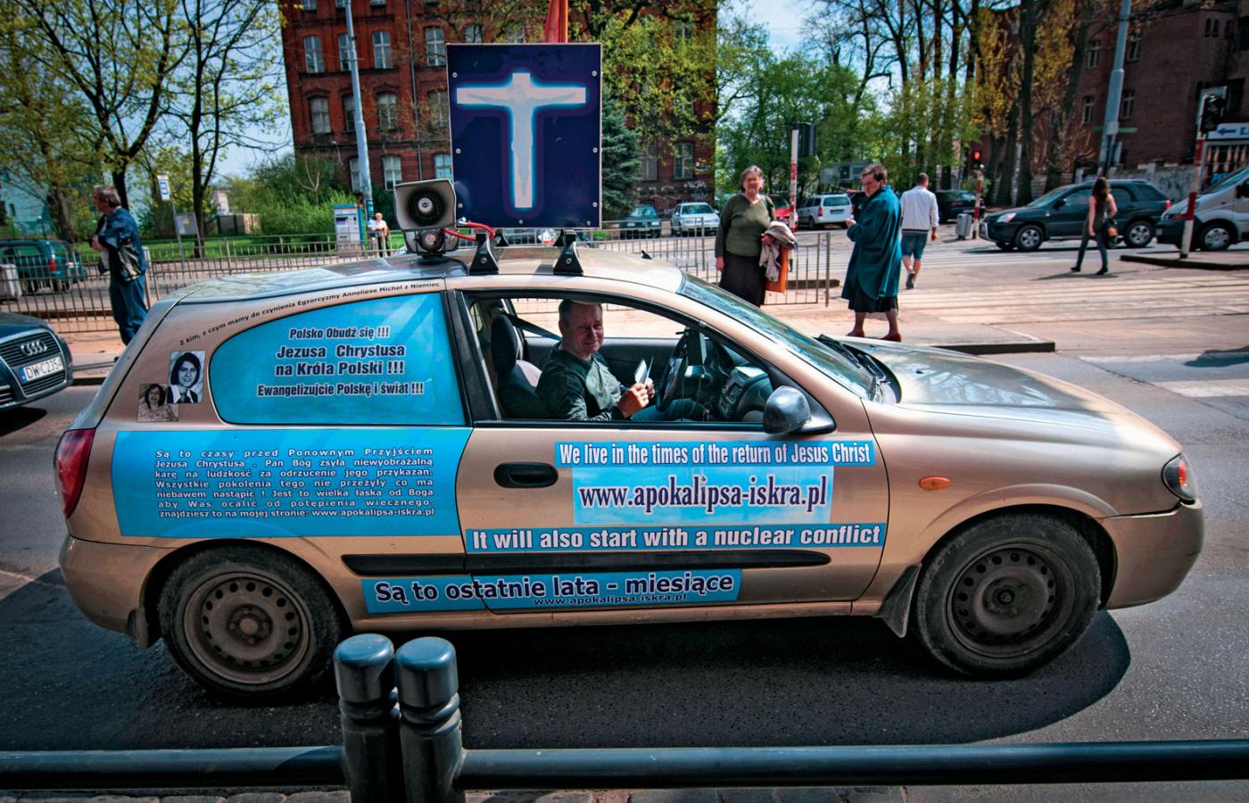 Ten terroryzm uprawiał przez głośniki umieszczone na dachu – zapętlona empetrójka trzeszczała o apokalipsie i karze za grzechy, wzywała do nawrócenia na Jezusa Chrystusa na dużych wrocławskich ulicach i małych uliczkach osiedlowych. Sam głos tak jeździł, twarz ukryta była za samochodową szybą.