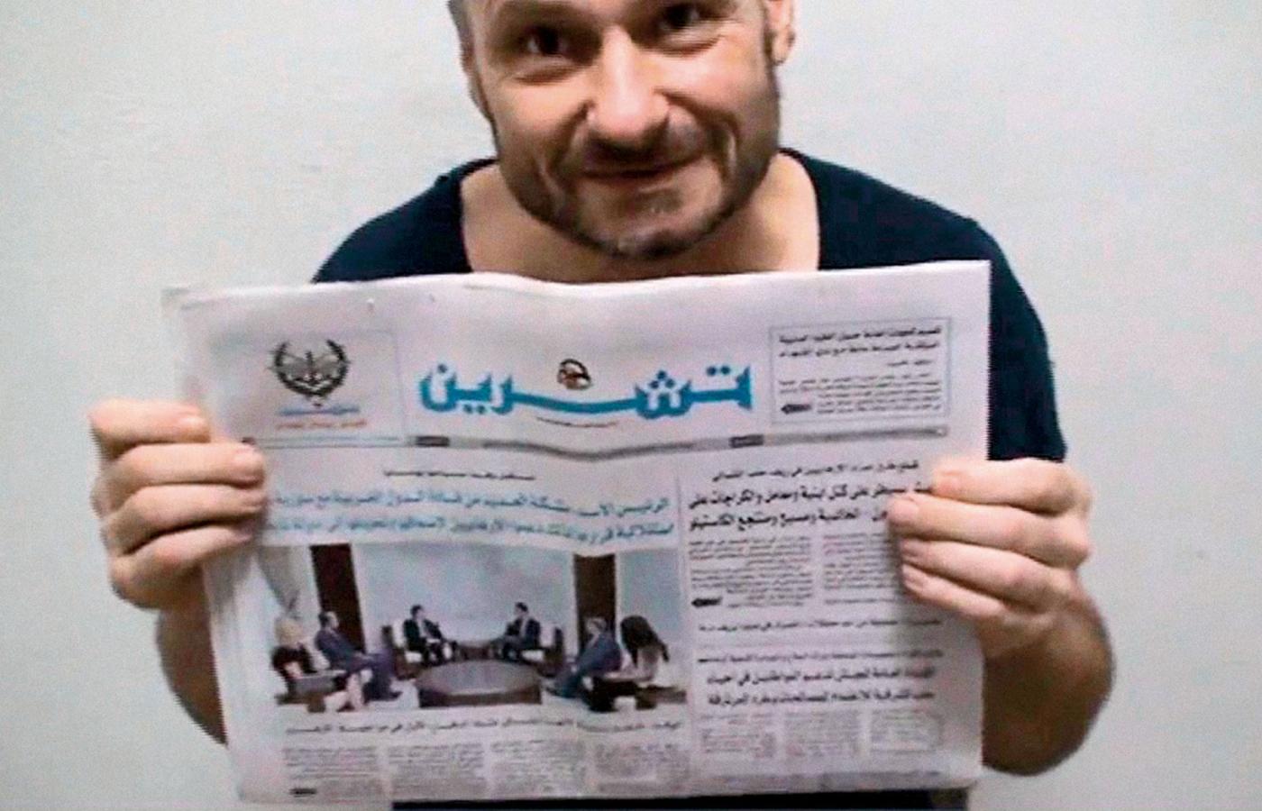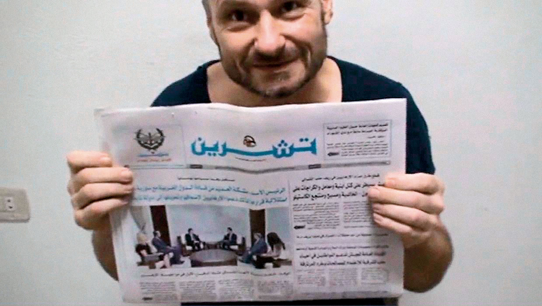 Na zdjęciu obok artykułu na syryjskim portalu internetowym w czarnym podkoszulku siedzi na tle białej ściany. W ręku trzyma gazetę, rządowy dziennik „Tishreen” z 27 lipca tego roku, zawiadamiający na pierwszej stronie o przyjęciu przez prezydenta Asada delegacji z Grecji.