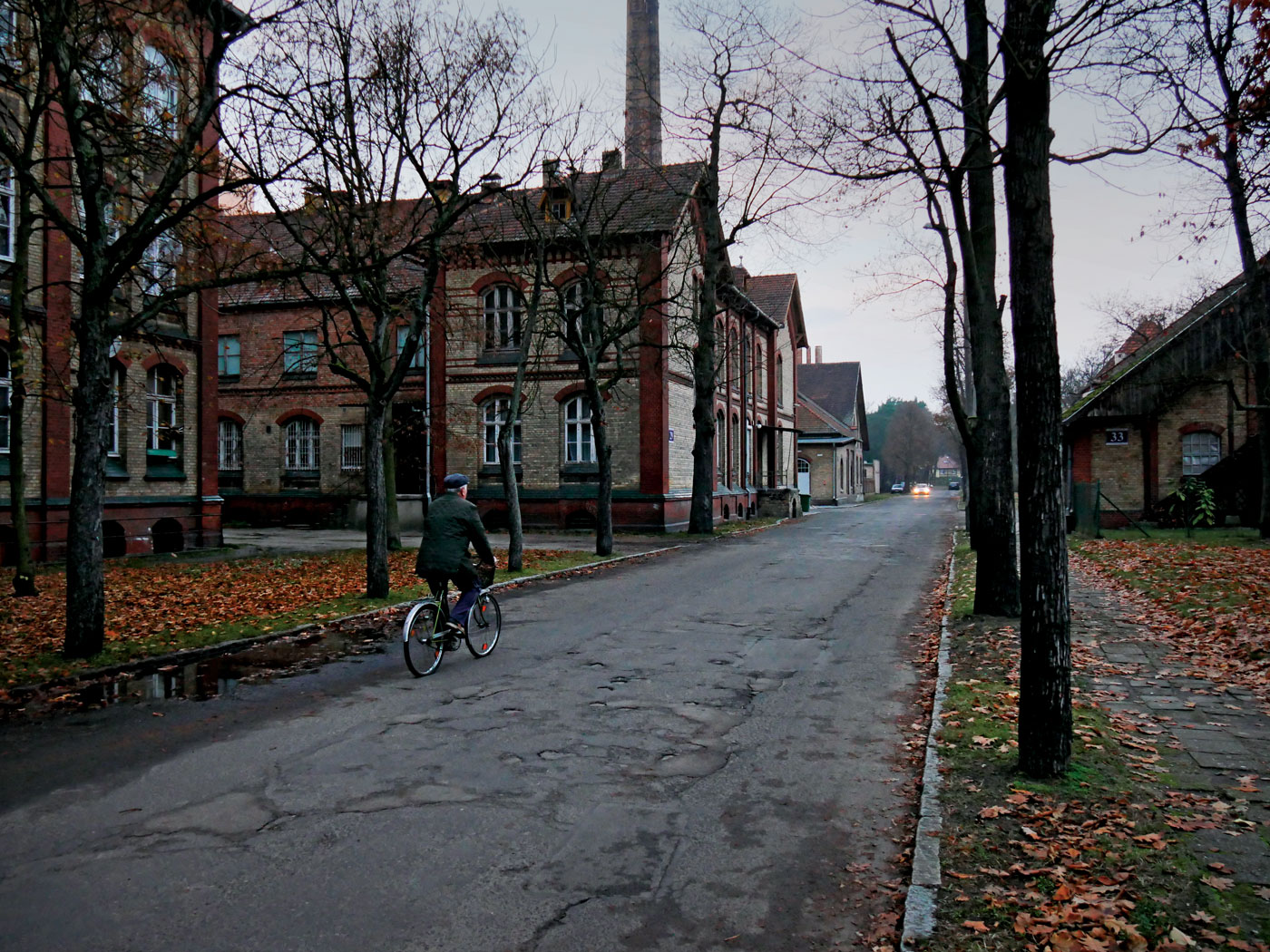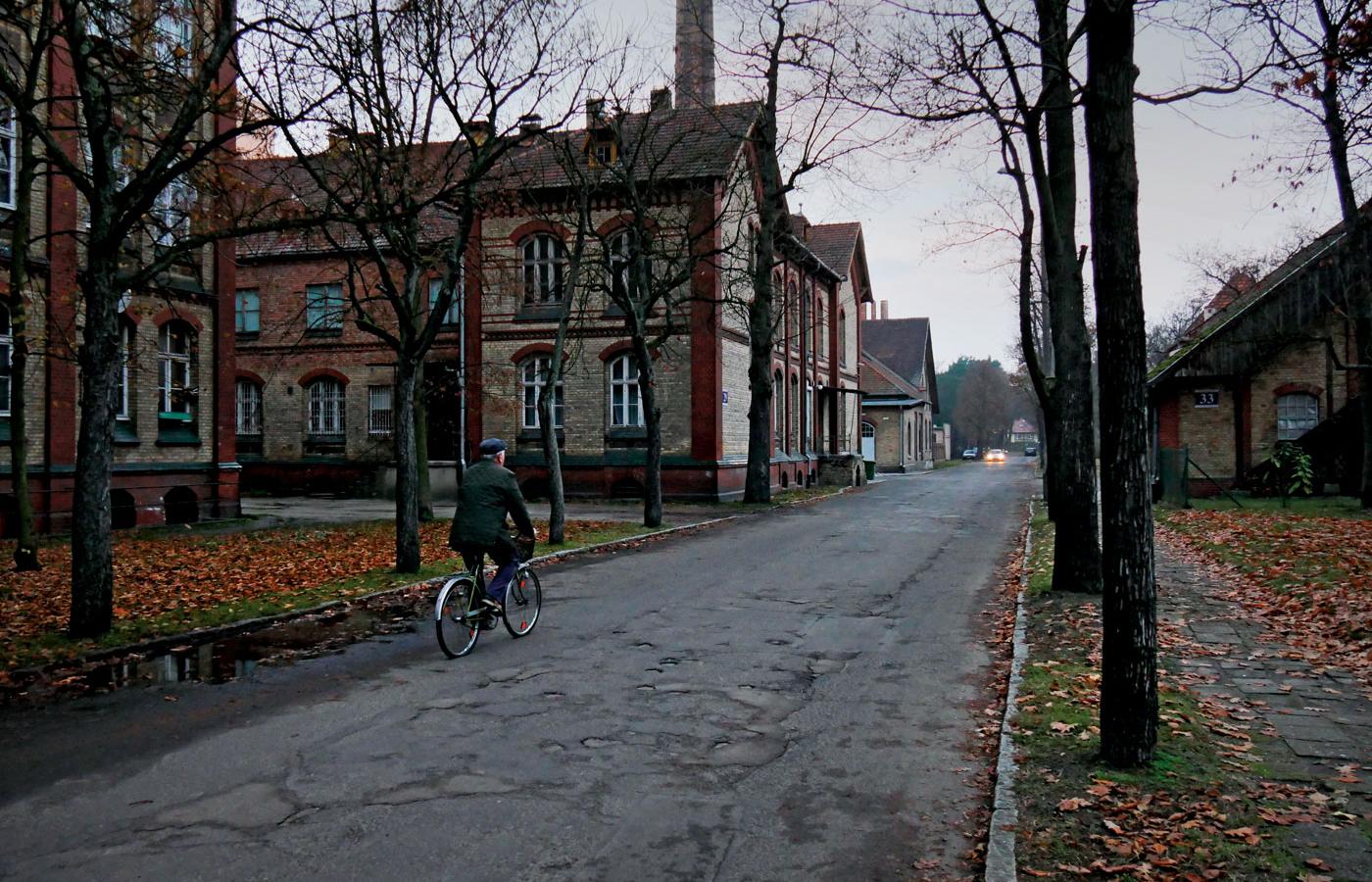 Brama, kościół, willa dyrektorska, administracja, wieża ciśnień, kuchnia, pralnia. Maszynownia, warsztaty, kotłownia, magazyn, lodownia. Oddziały – po obu stronach, symetrycznie, w rzędach. Prosektorium. 516 m drogi głównej dzieli bramę od prosektorium. Musieli tędy chodzić. Przenikliwym okiem gospodarza badać całą tę czerwonocegłą niepowściągliwość: wieżyczki, gzymsy, filary, schodki, ornamenty, załomy, zakamarki, daszki, wykusze. O czymś myśleć. Pewnie czasem o człowieku.