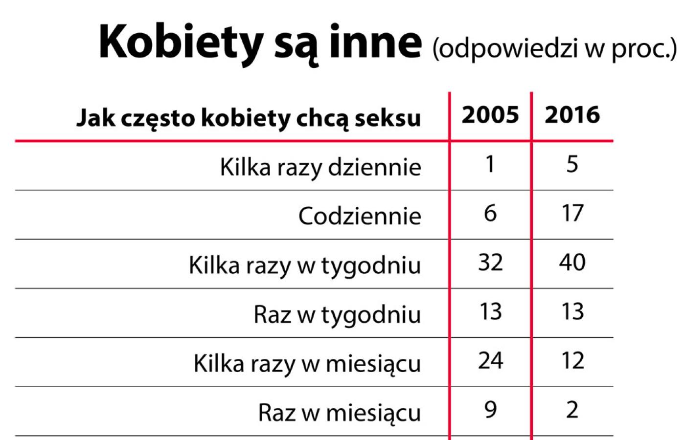 Bo ogólnie potrzeby seksualne rosną. Grupa osób, które przynajmniej raz dziennie mają ochotę na seks, wzrosła prawie trzykrotnie w ciągu 10 lat. Dziś należy do niej prawie co czwarty dorosły. Ale potrzeby kobiet wzrosły o połowę. A mężczyzn o jedną trzecią. Kobiety deklarują już takie potrzeby, jakie przed dekadą deklarowali mężczyźni.
