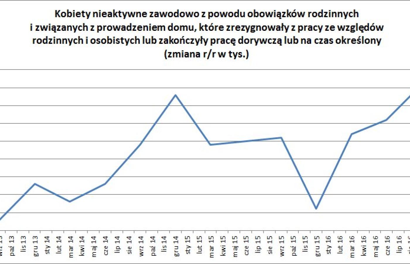 Wykres GUS przypomina masyw górski. Opada w doliny na wiosnę, aby jesienią wystrzelić w górę i znów spaść w dół w okolicach marca, kwietnia. To, co widoczne gołym okiem, przekłada się na dane „dotyczące kobiet nieaktywnych zawodowo z powodu obowiązków rodzinnych i związanych z prowadzeniem domu, które zrezygnowały z pracy ze względów osobistych”.